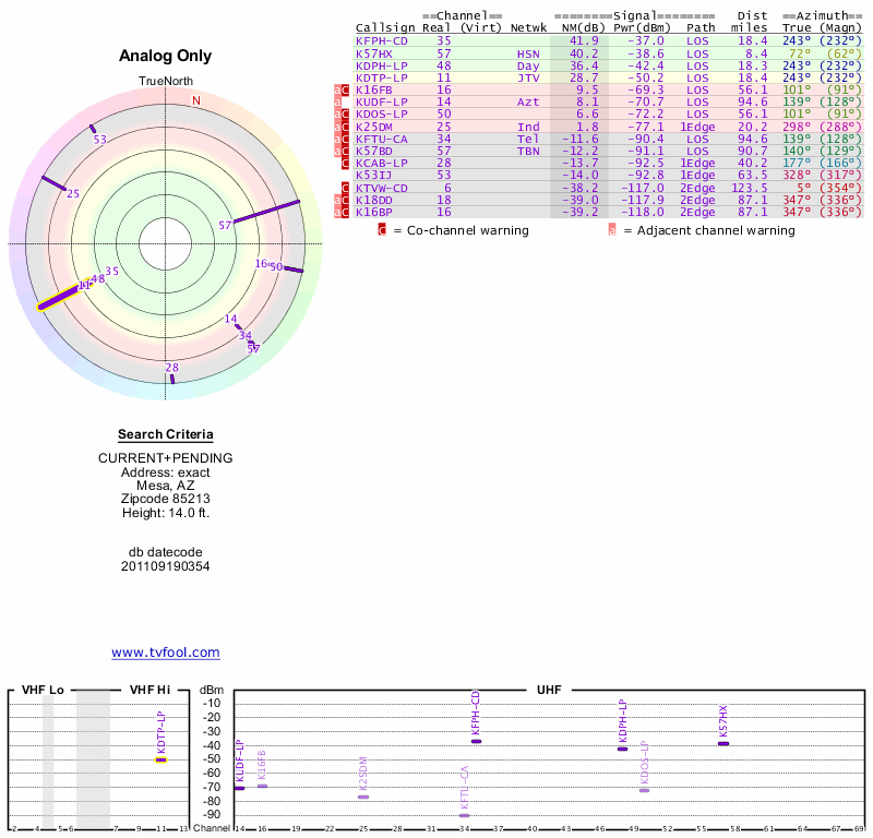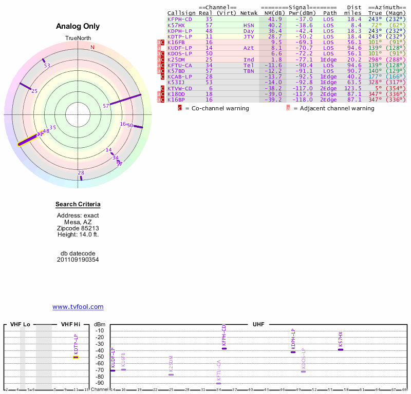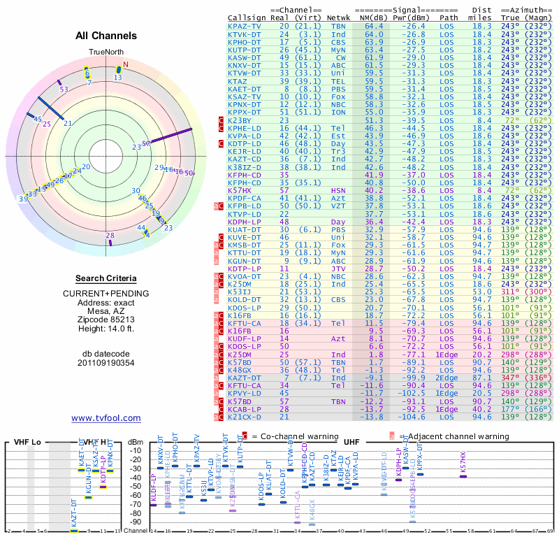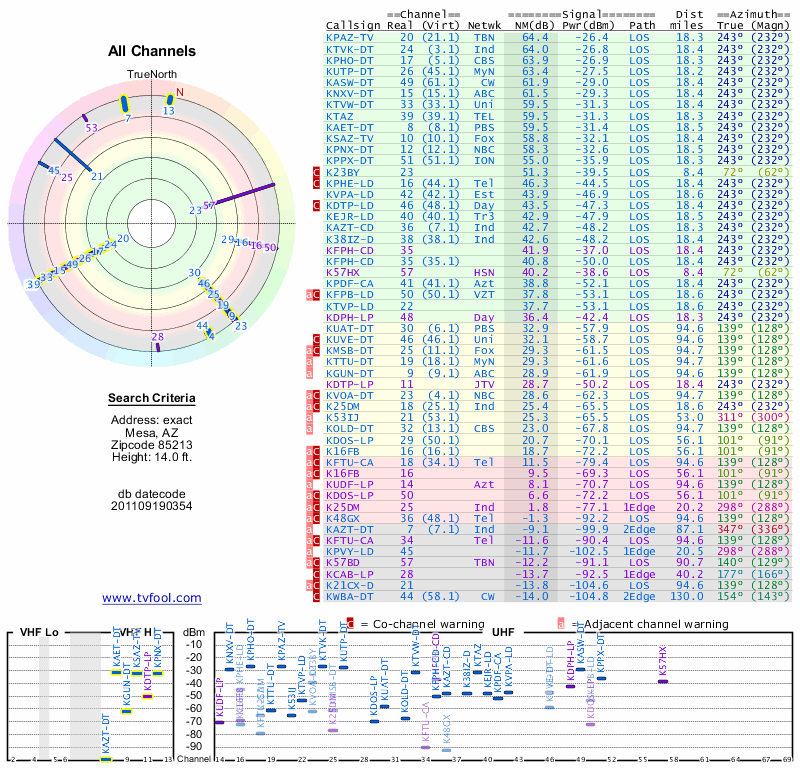 Here are the results for your location. The transmitter database was last updated on June 7, 2013. For more information about these plots and how to interpret them, please check out the Signal Analysis FAQ.