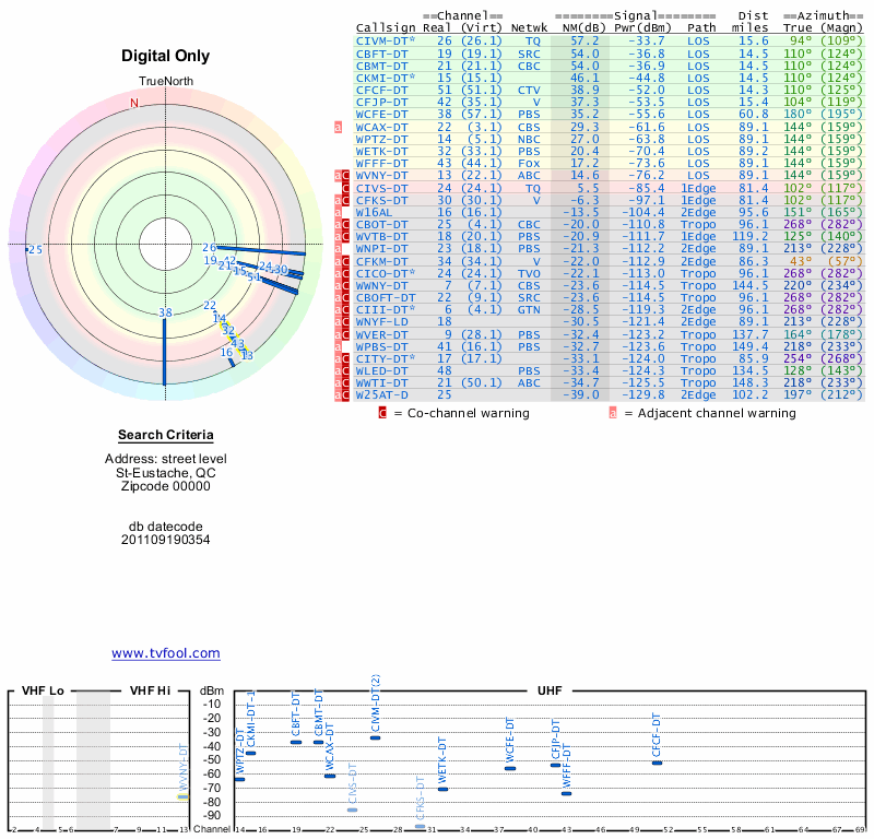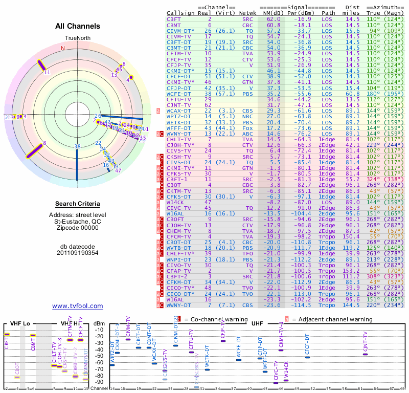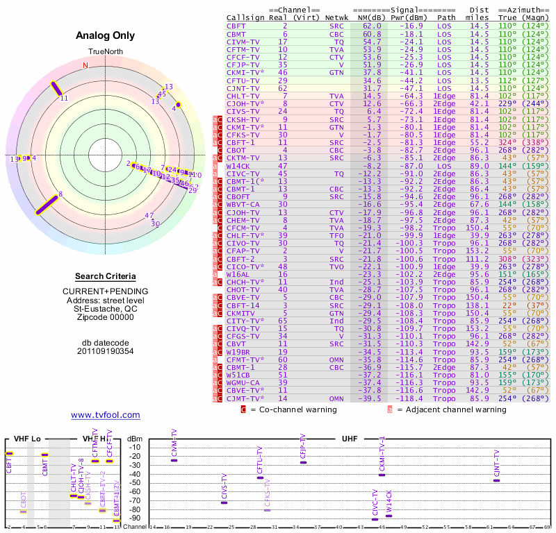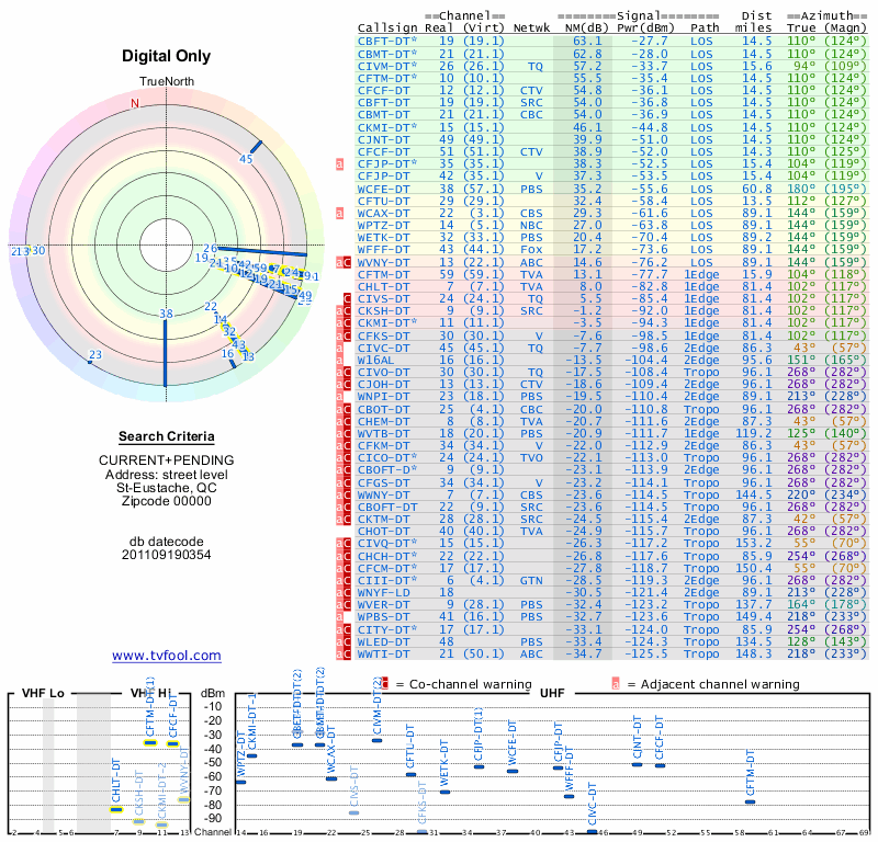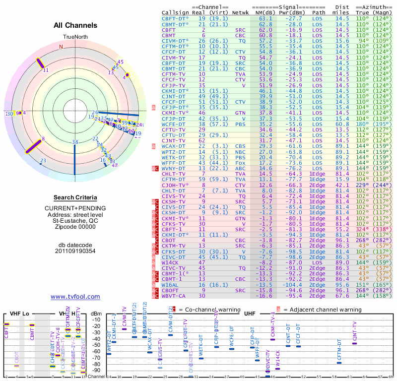 Here are the results for your location. The transmitter database was last updated on June 7, 2013. For more information about these plots and how to interpret them, please check out the Signal Analysis FAQ.