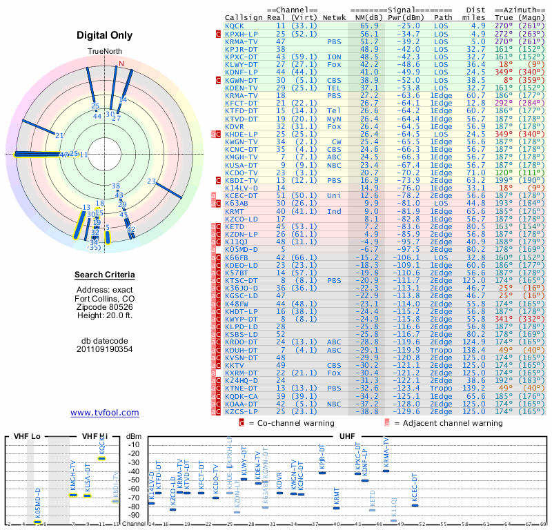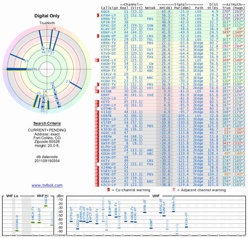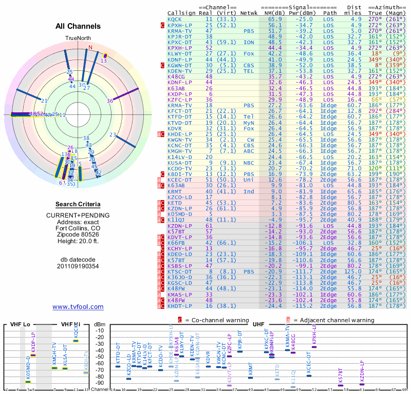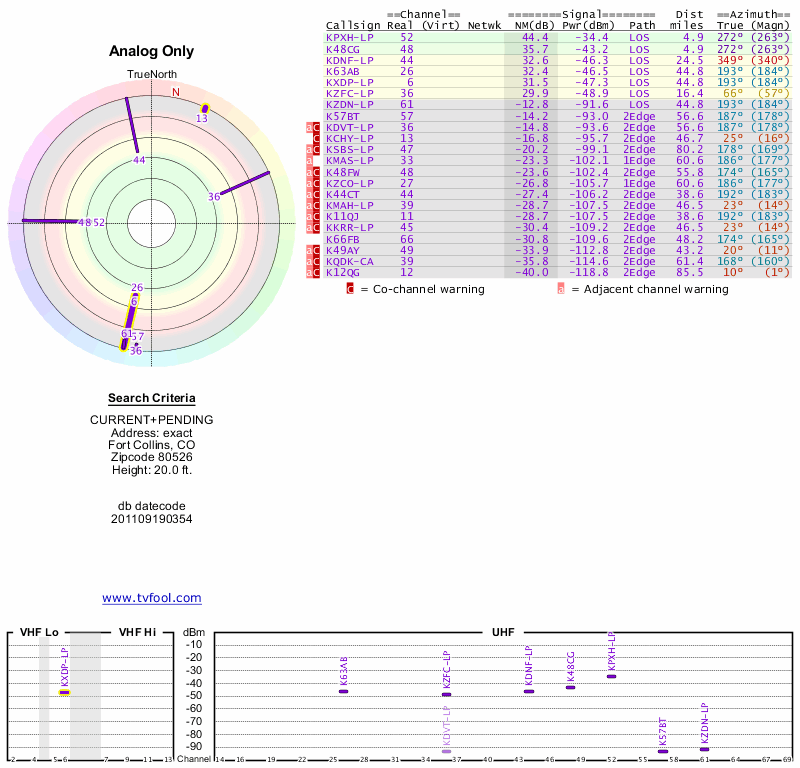 Here are the results for your location. The transmitter database was last updated on June 7, 2013. For more information about these plots and how to interpret them, please check out the Signal Analysis FAQ.