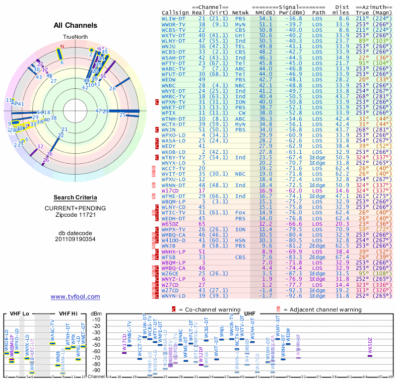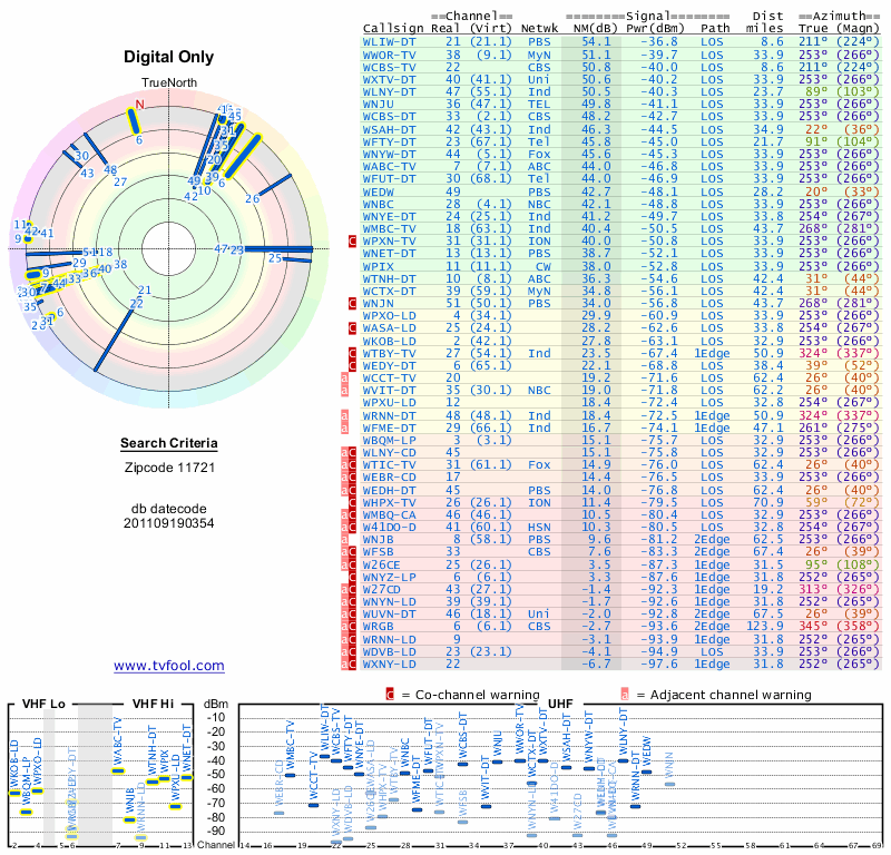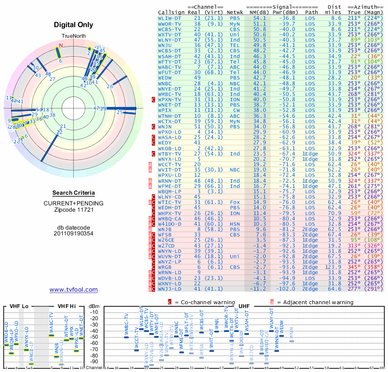 Here are the results for your location. The transmitter database was last updated on June 7, 2013. For more information about these plots and how to interpret them, please check out the Signal Analysis FAQ.