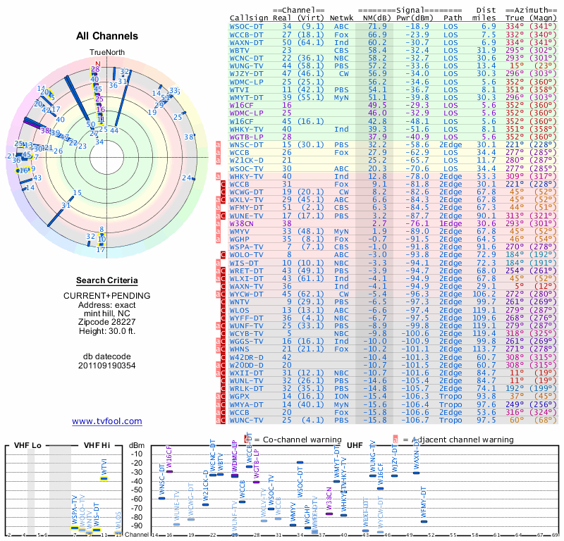 Here are the results for your location. The transmitter database was last updated on June 7, 2013. For more information about these plots and how to interpret them, please check out the Signal Analysis FAQ.
