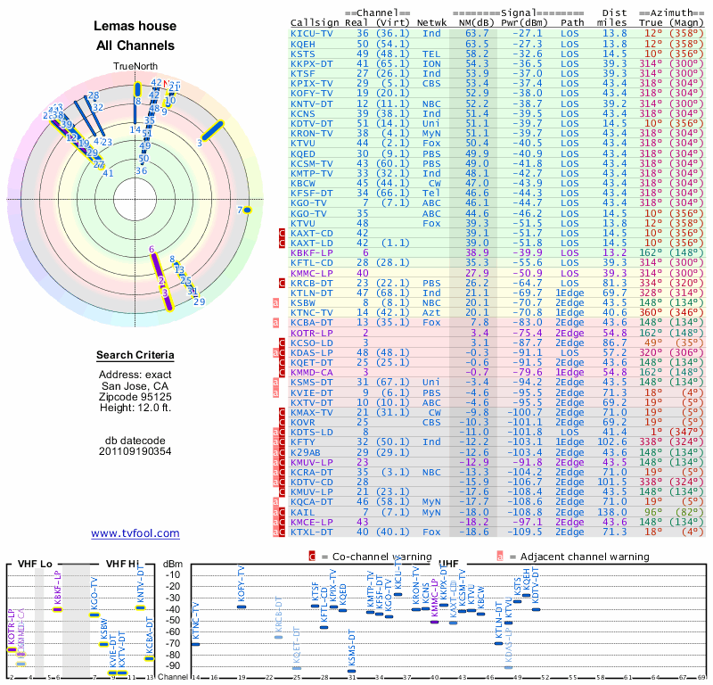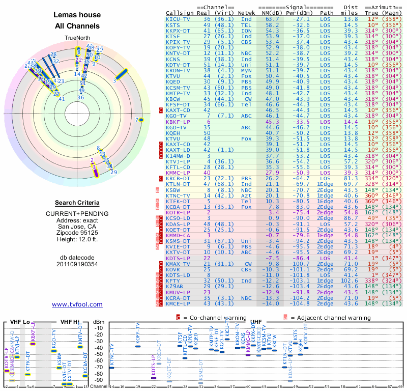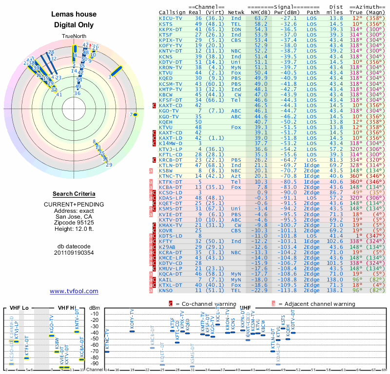 Here are the results for your location. The transmitter database was last updated on June 7, 2013. For more information about these plots and how to interpret them, please check out the Signal Analysis FAQ.