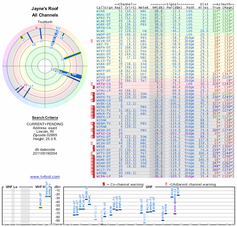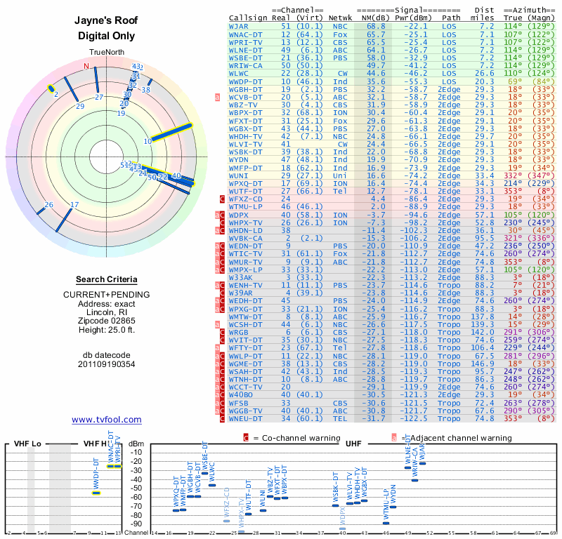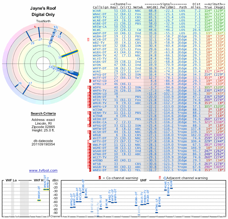 Here are the results for your location. The transmitter database was last updated on June 7, 2013. For more information about these plots and how to interpret them, please check out the Signal Analysis FAQ.