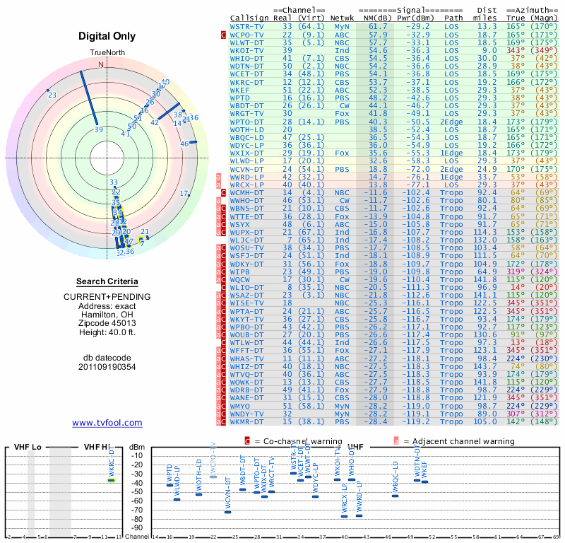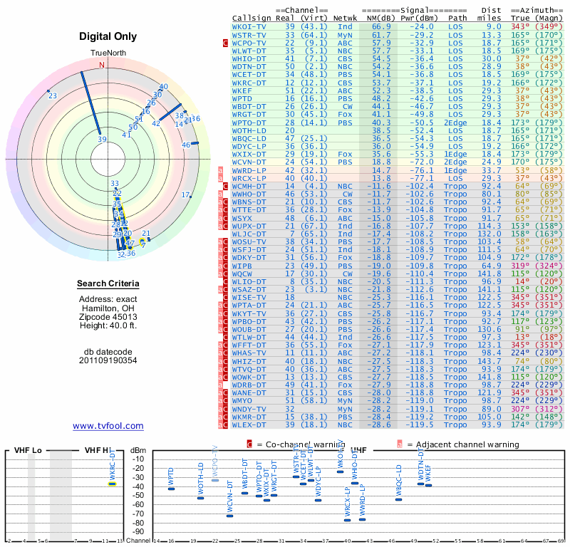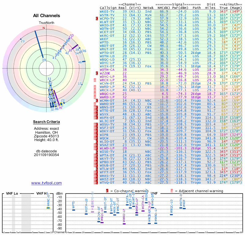 Here are the results for your location. The transmitter database was last updated on June 7, 2013. For more information about these plots and how to interpret them, please check out the Signal Analysis FAQ.