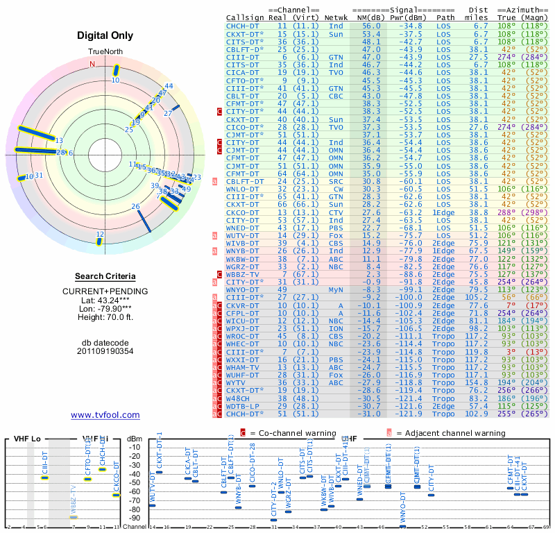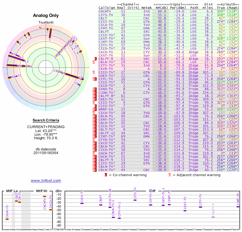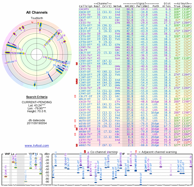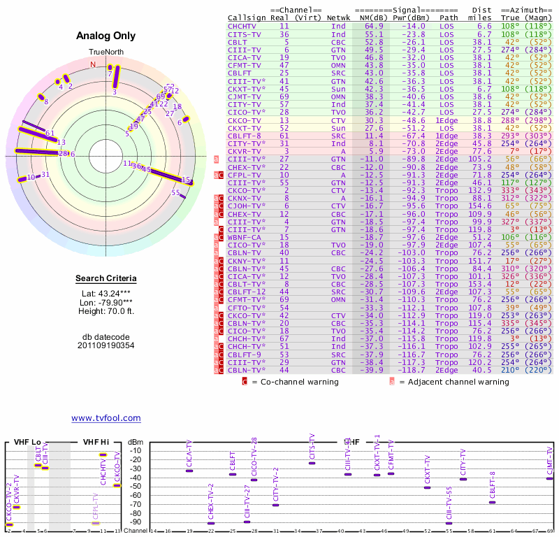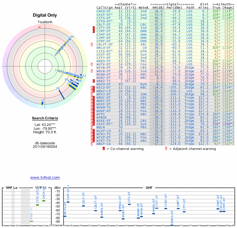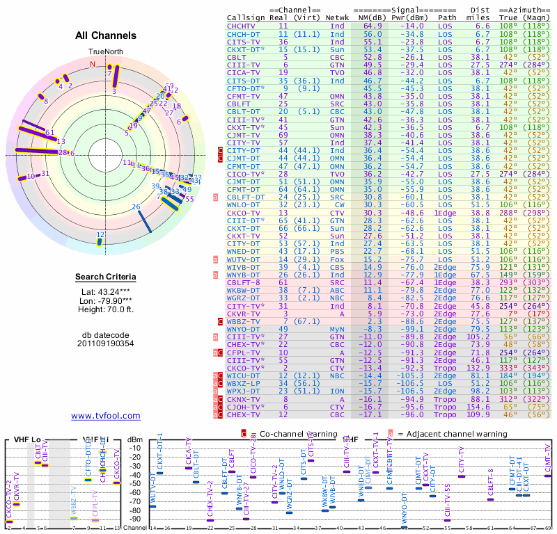 Here are the results for your location. The transmitter database was last updated on June 7, 2013. For more information about these plots and how to interpret them, please check out the Signal Analysis FAQ.