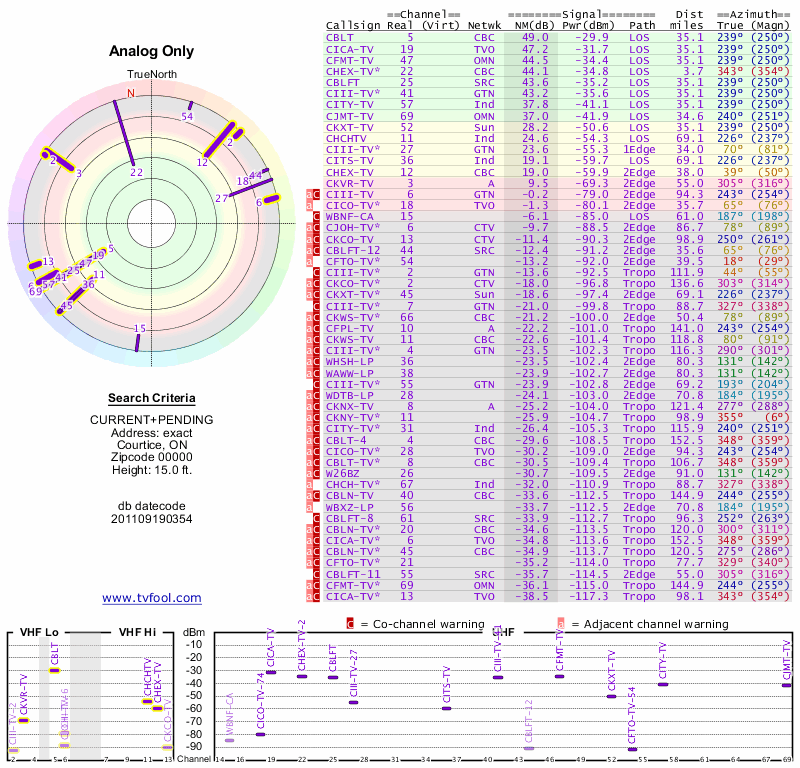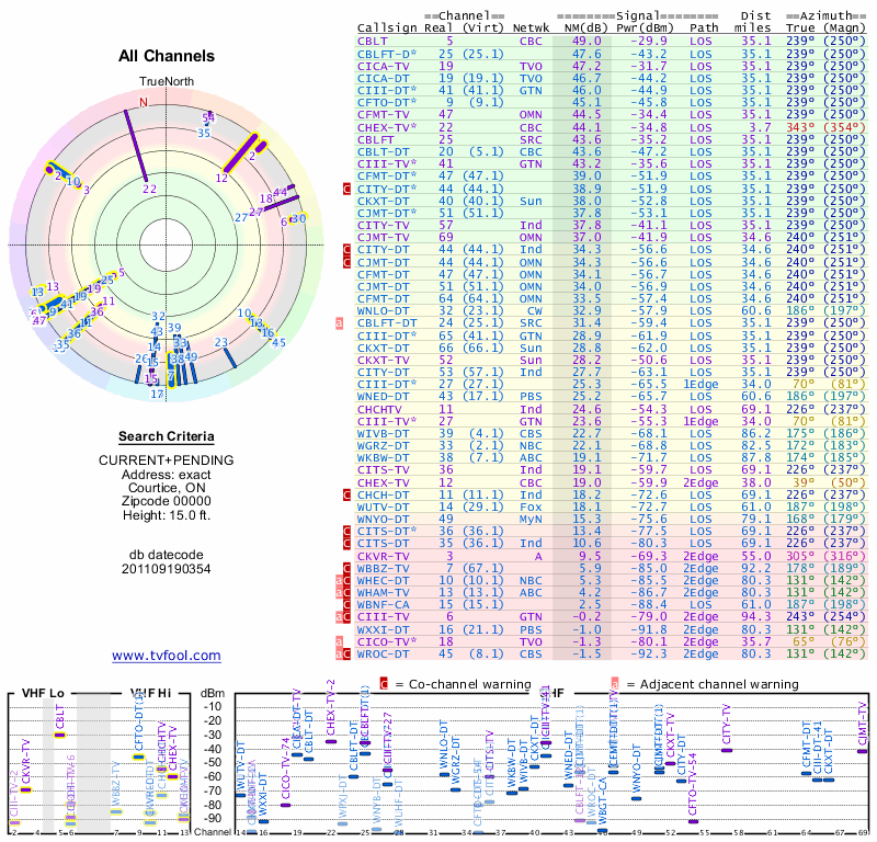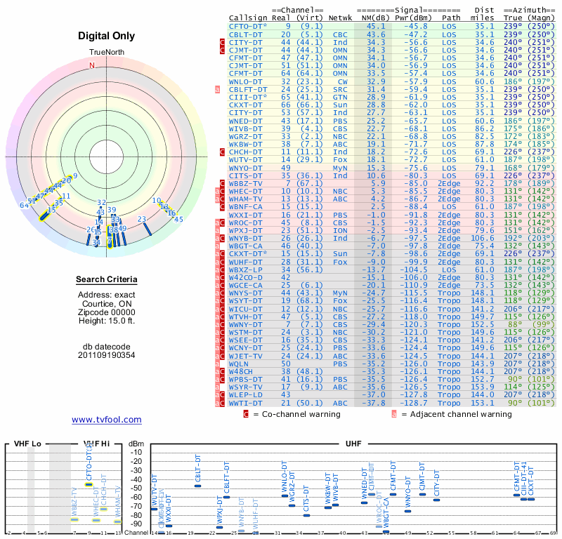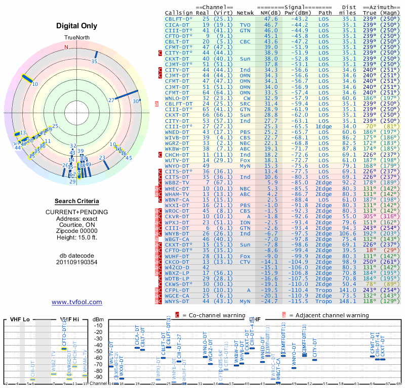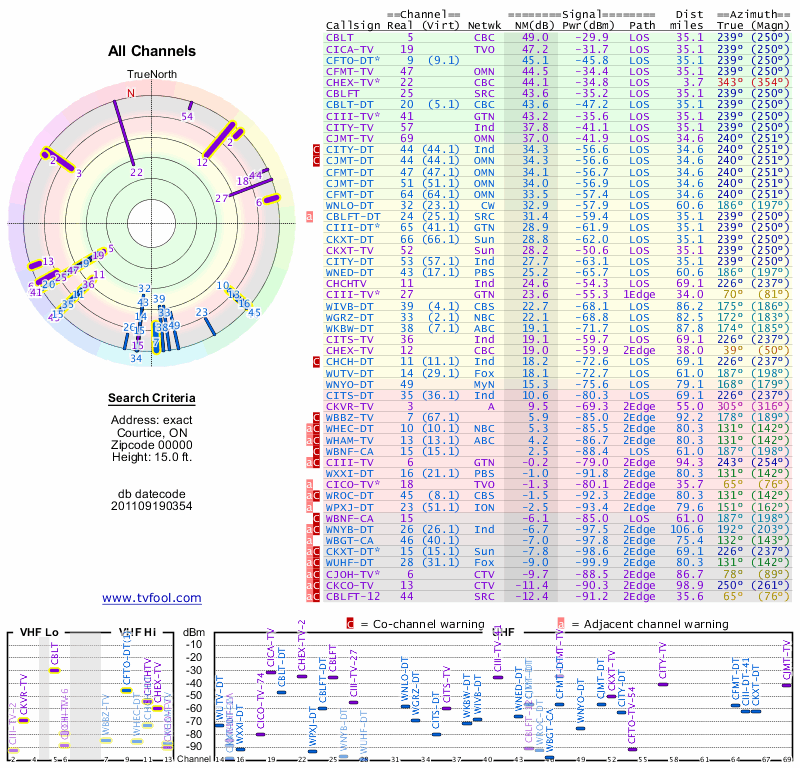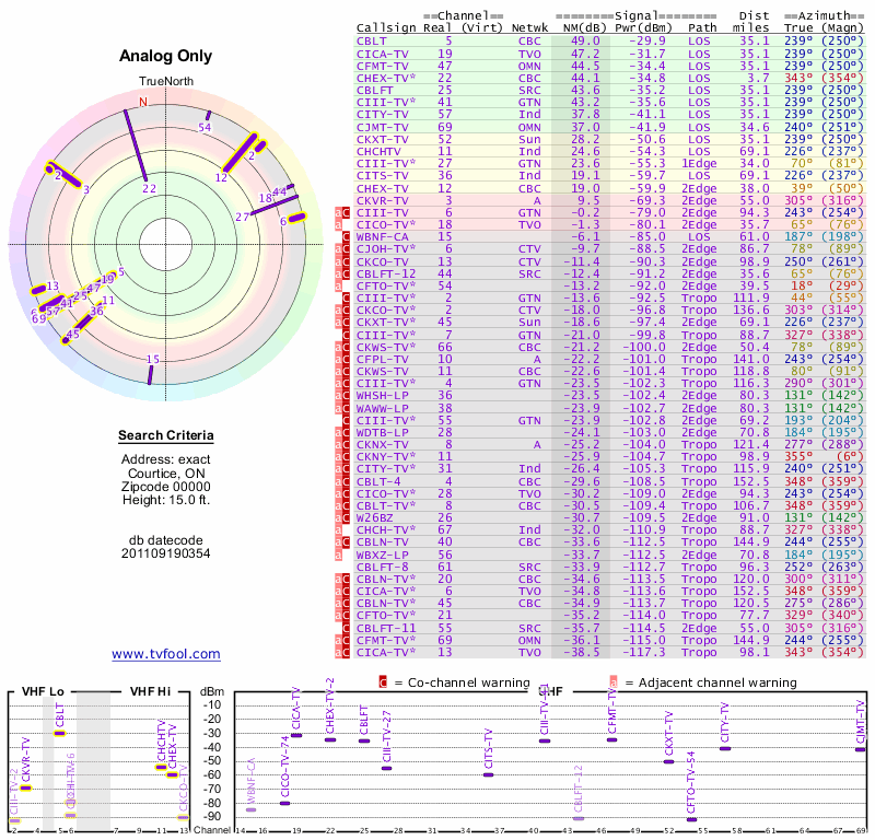 Here are the results for your location. The transmitter database was last updated on June 7, 2013. For more information about these plots and how to interpret them, please check out the Signal Analysis FAQ.