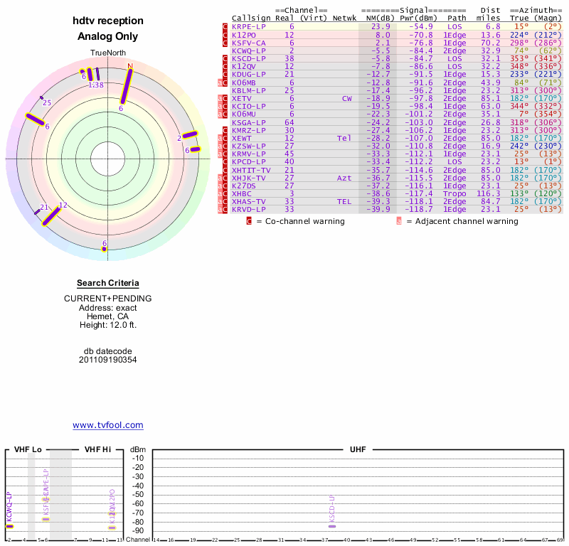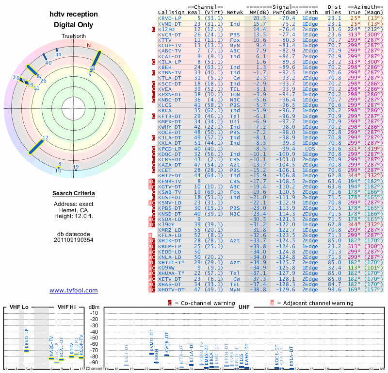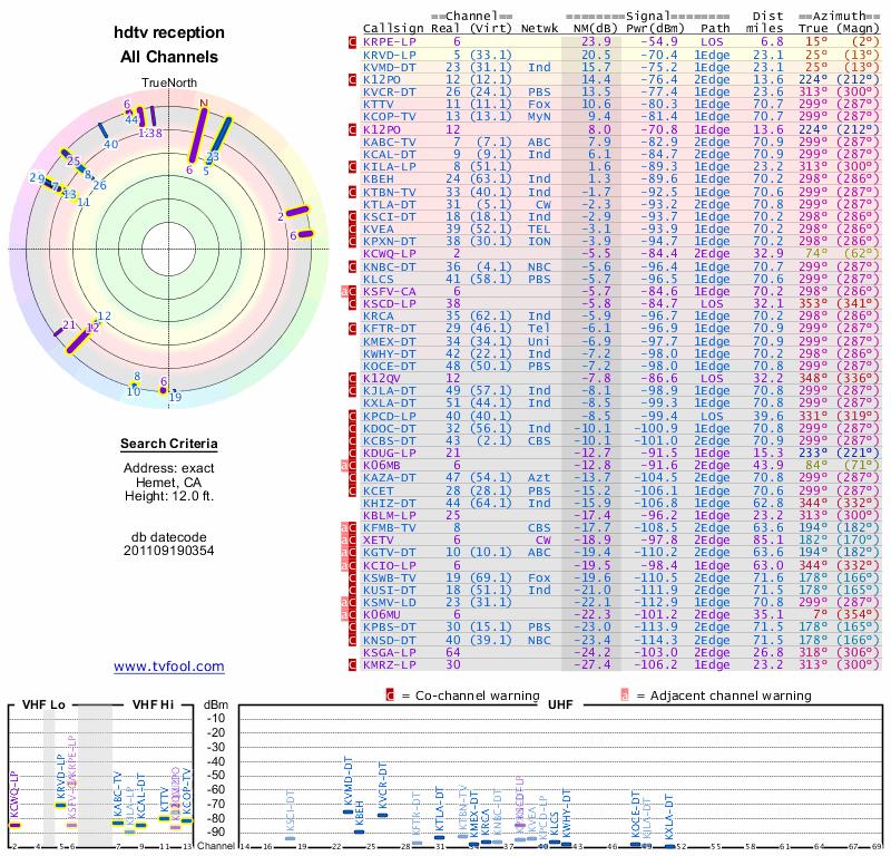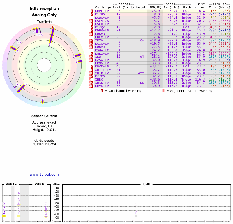 Here are the results for your location. The transmitter database was last updated on June 7, 2013. For more information about these plots and how to interpret them, please check out the Signal Analysis FAQ.