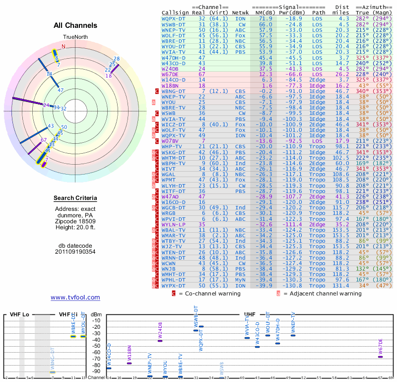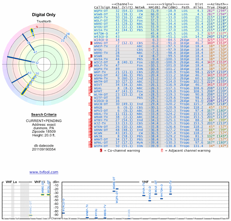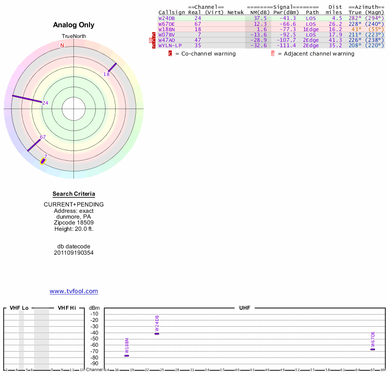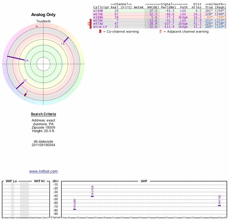 Here are the results for your location. The transmitter database was last updated on June 7, 2013. For more information about these plots and how to interpret them, please check out the Signal Analysis FAQ.