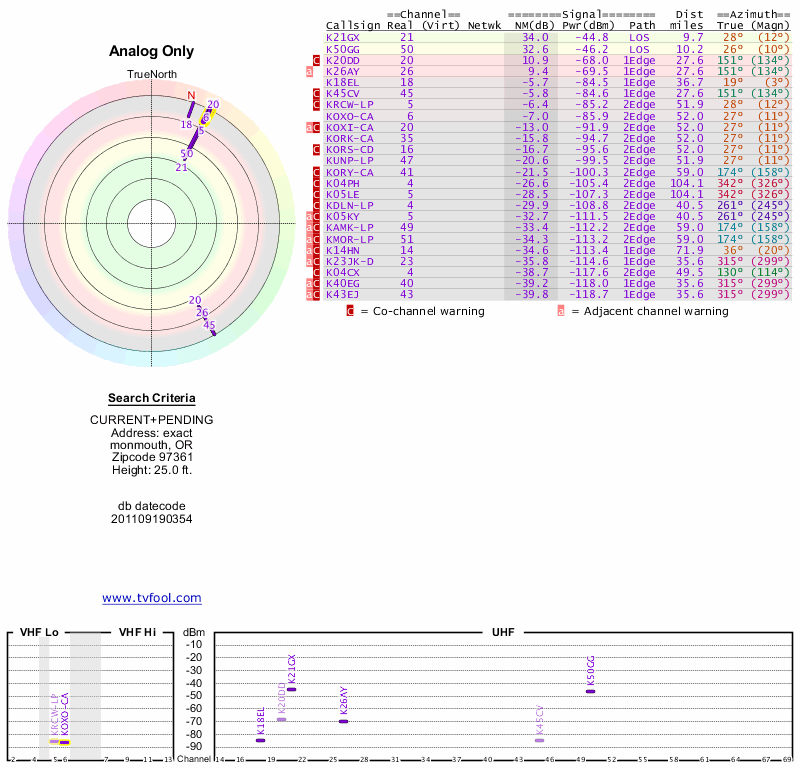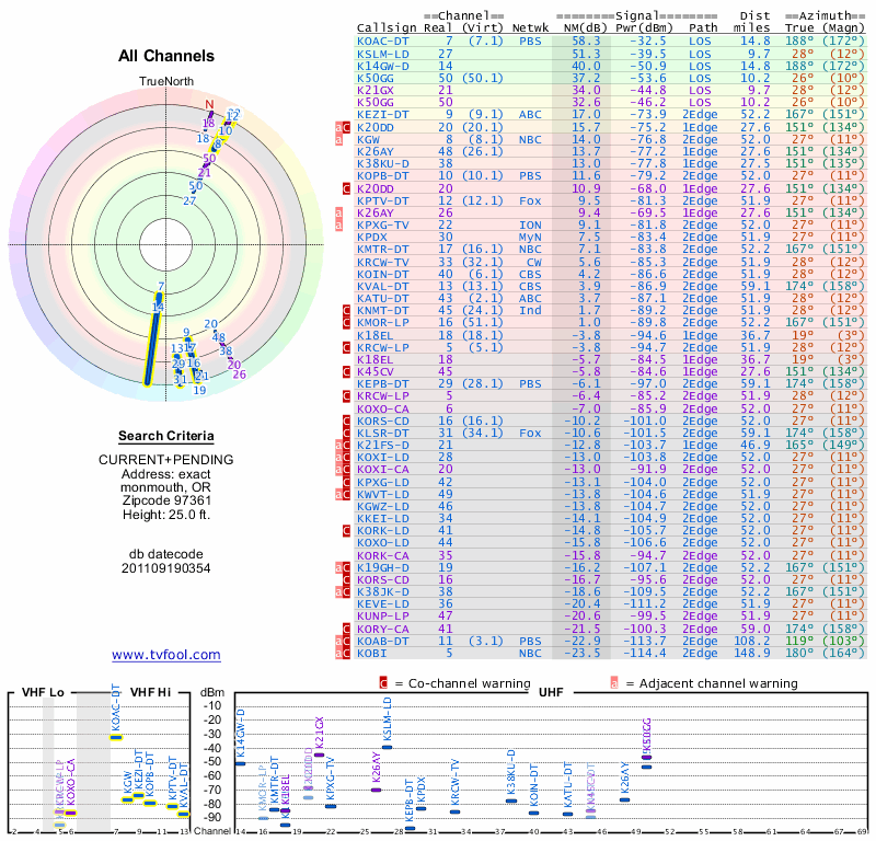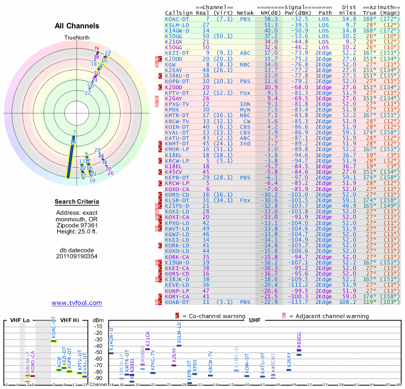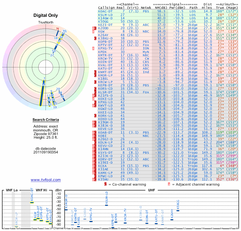Here are the results for your location. The transmitter database was last updated on June 7, 2013. For more information about these plots and how to interpret them, please check out the Signal Analysis FAQ.