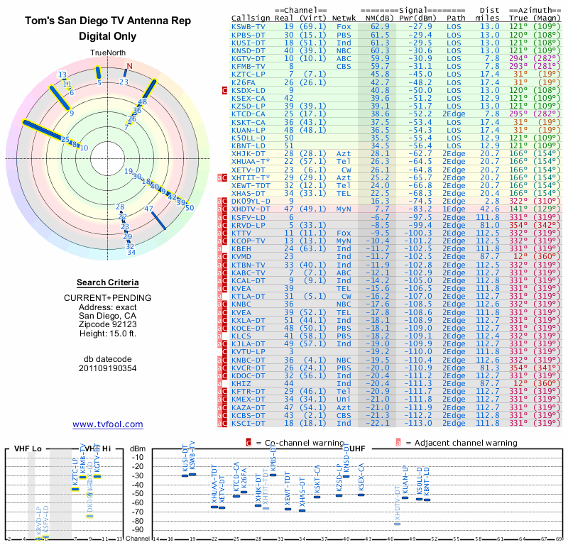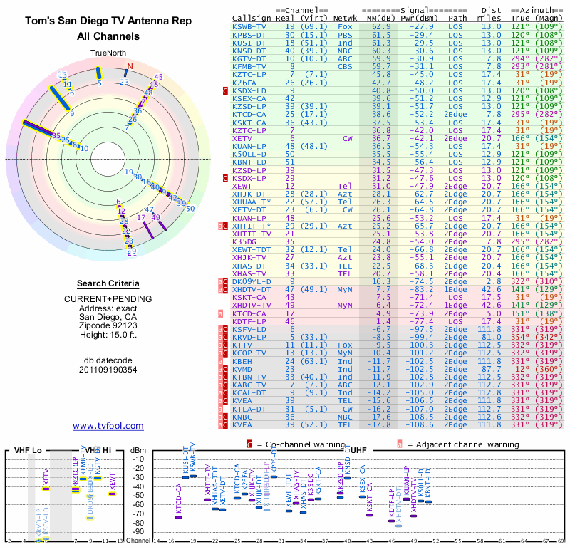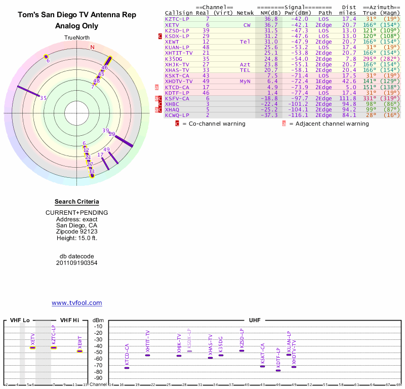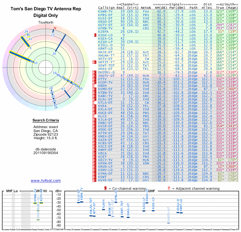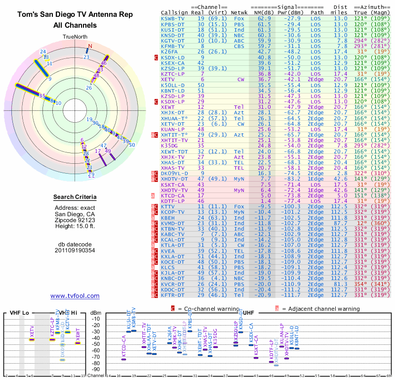 Here are the results for your location. The transmitter database was last updated on June 7, 2013. For more information about these plots and how to interpret them, please check out the Signal Analysis FAQ.