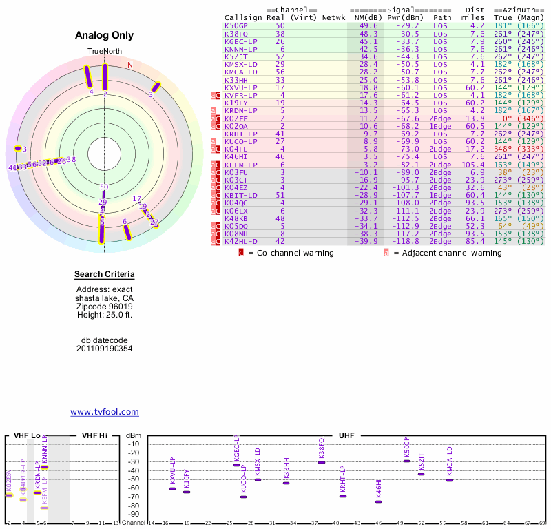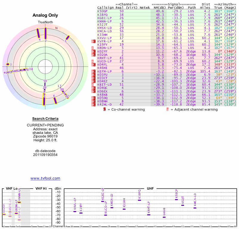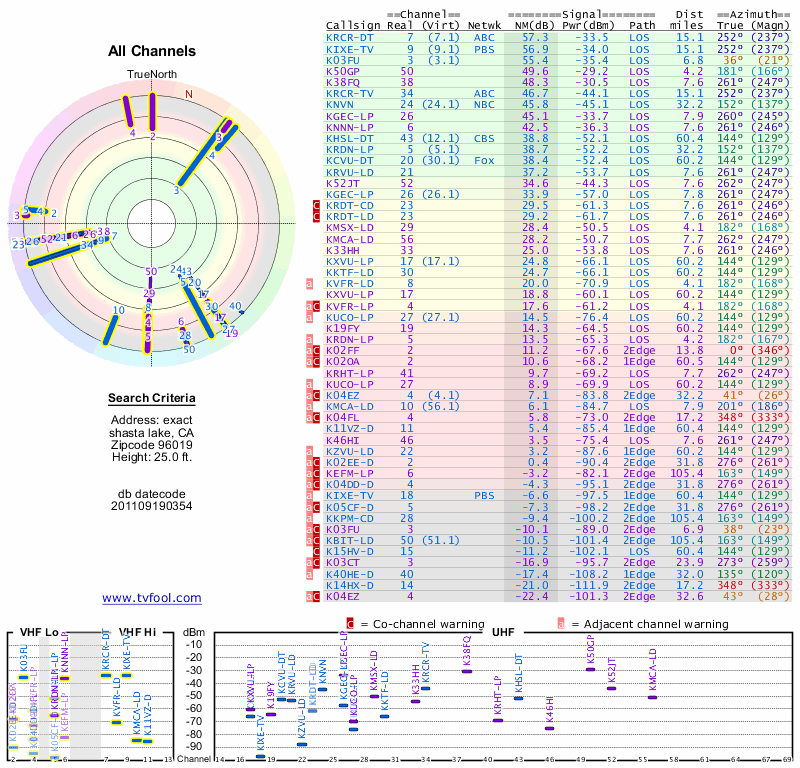 Here are the results for your location. The transmitter database was last updated on June 7, 2013. For more information about these plots and how to interpret them, please check out the Signal Analysis FAQ.