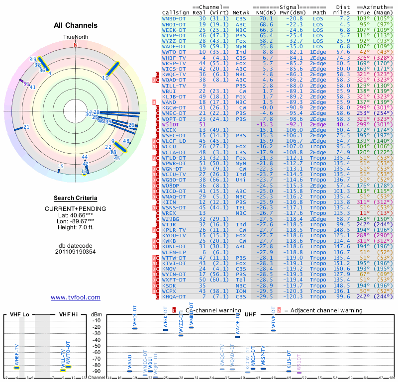 Here are the results for your location. The transmitter database was last updated on June 7, 2013. For more information about these plots and how to interpret them, please check out the Signal Analysis FAQ.