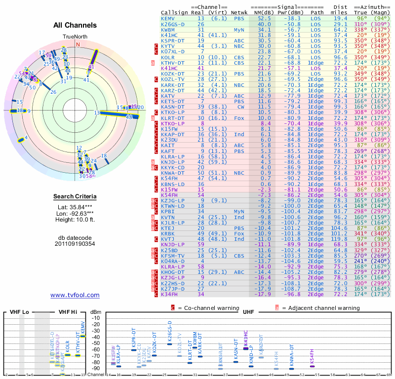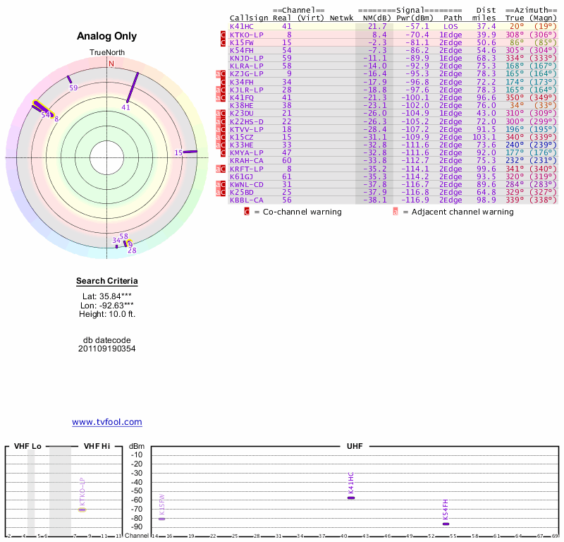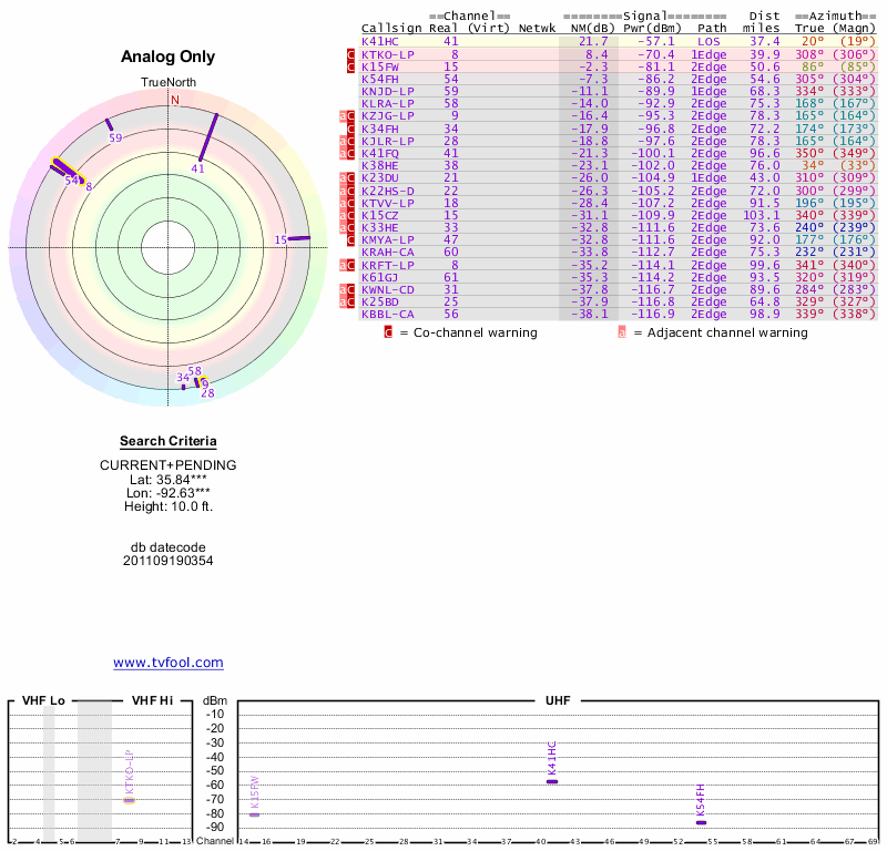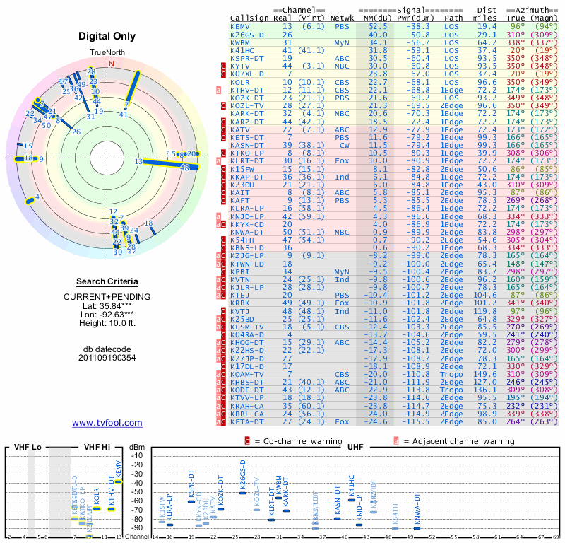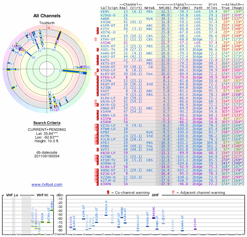 Here are the results for your location. The transmitter database was last updated on June 7, 2013. For more information about these plots and how to interpret them, please check out the Signal Analysis FAQ.