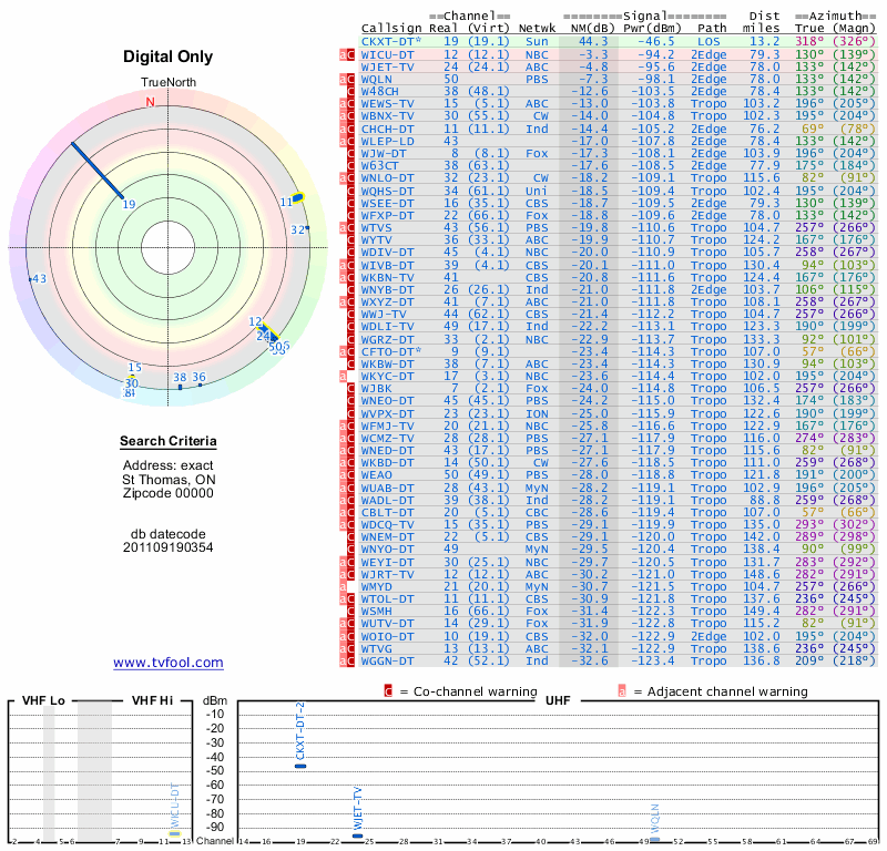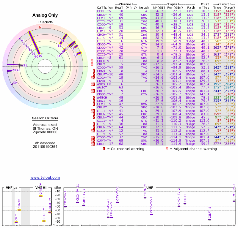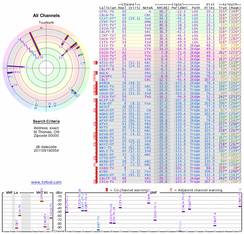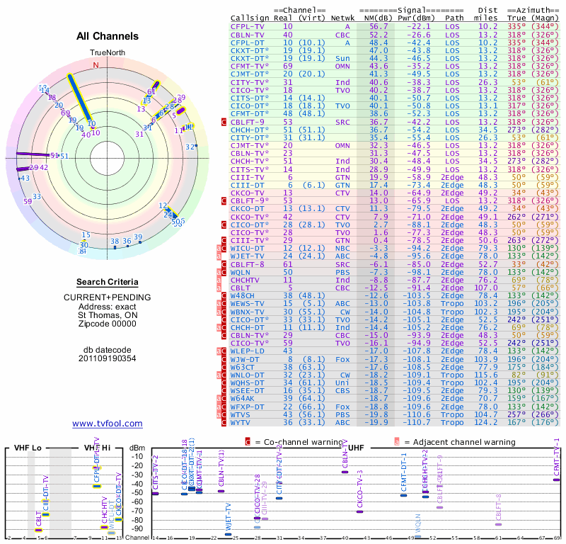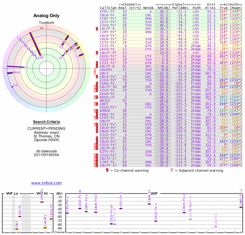 Here are the results for your location. The transmitter database was last updated on June 7, 2013. For more information about these plots and how to interpret them, please check out the Signal Analysis FAQ.