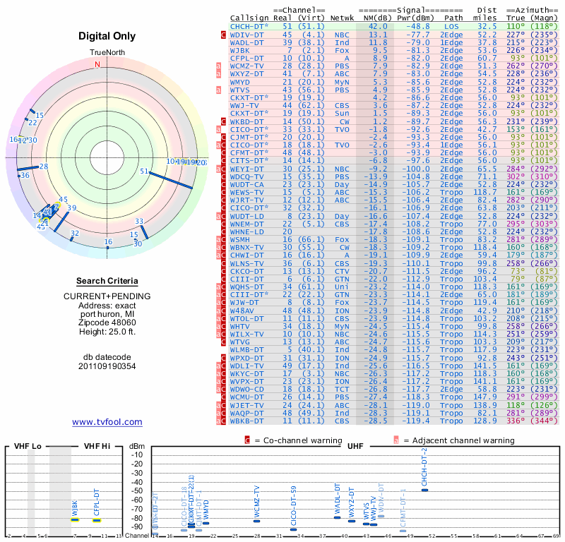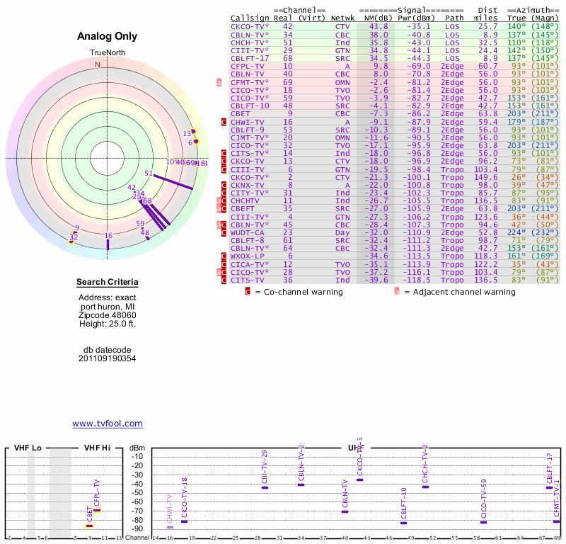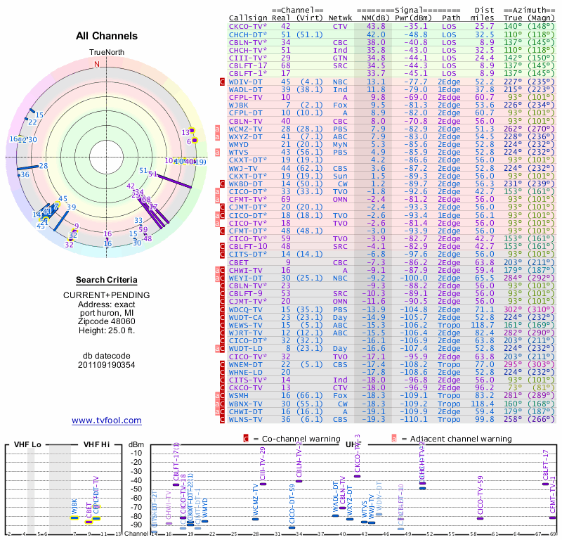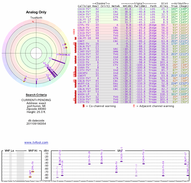 Here are the results for your location. The transmitter database was last updated on June 7, 2013. For more information about these plots and how to interpret them, please check out the Signal Analysis FAQ.