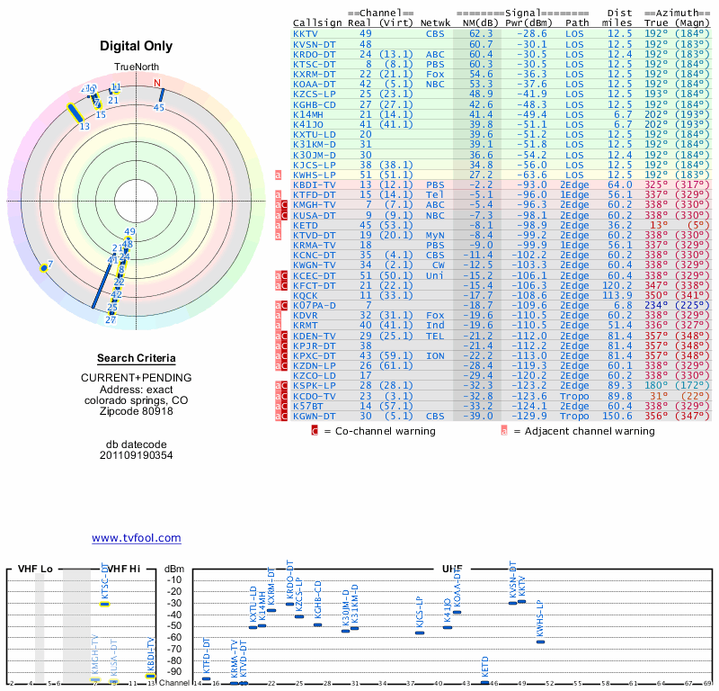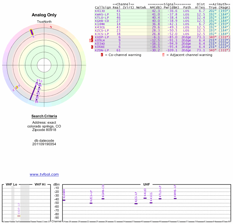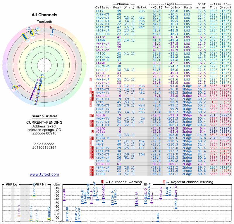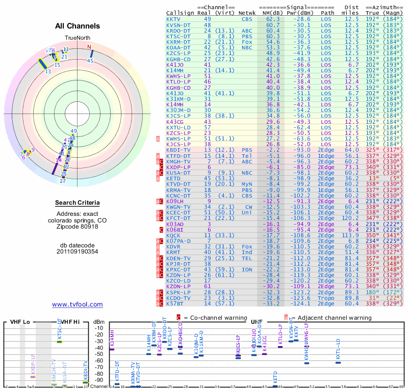 Here are the results for your location. The transmitter database was last updated on June 7, 2013. For more information about these plots and how to interpret them, please check out the Signal Analysis FAQ.