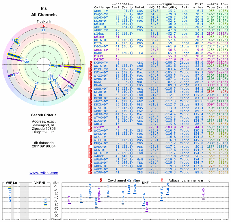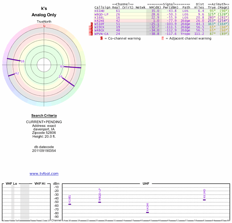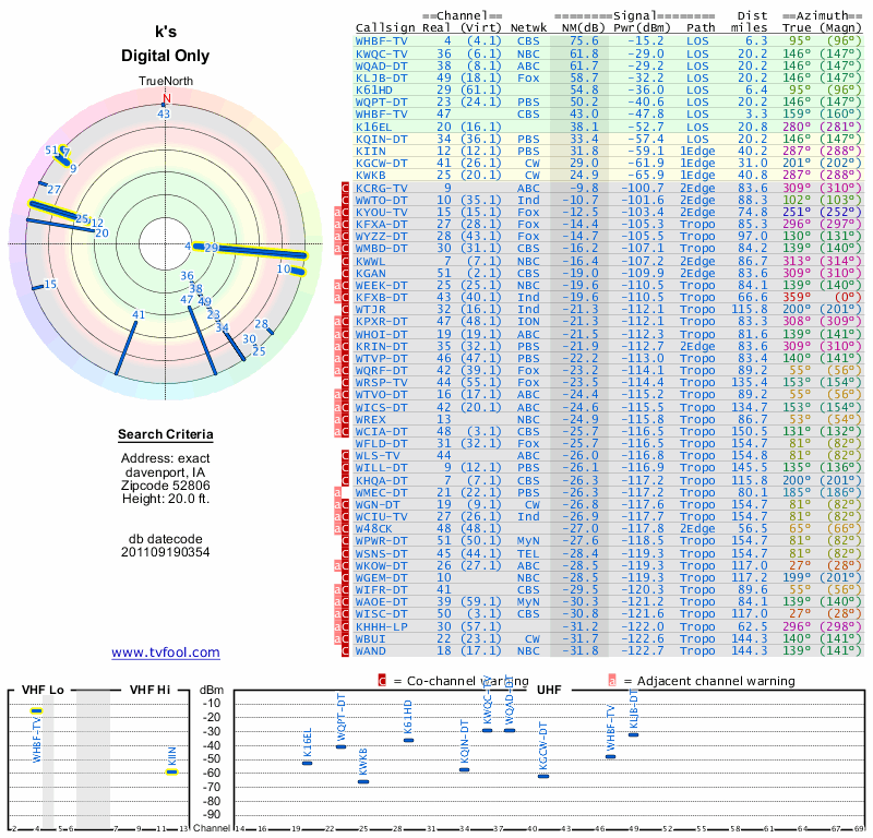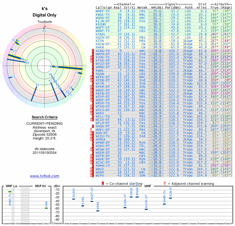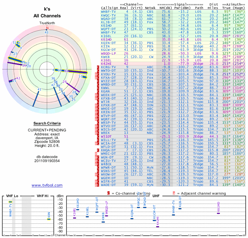 Here are the results for your location. The transmitter database was last updated on June 7, 2013. For more information about these plots and how to interpret them, please check out the Signal Analysis FAQ.