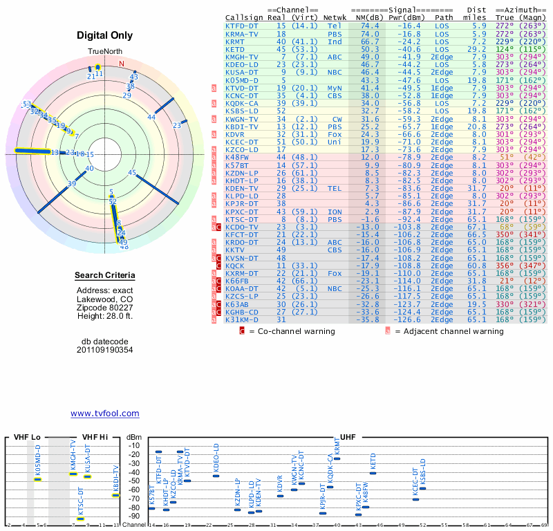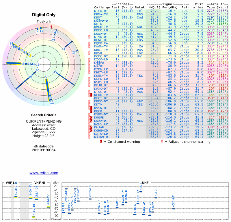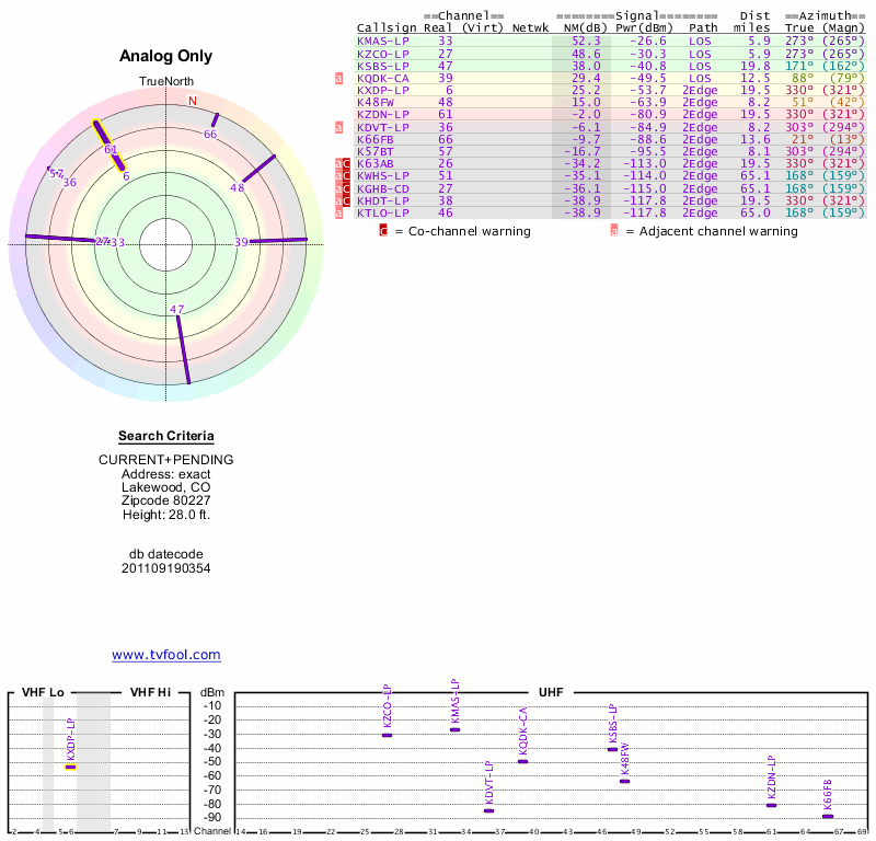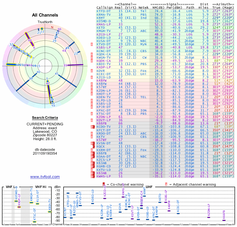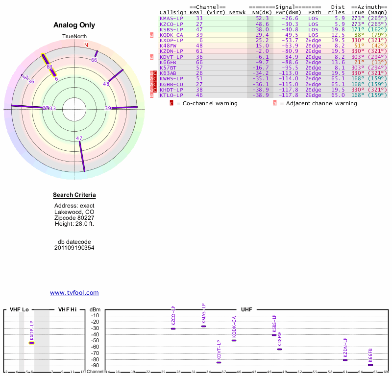 Here are the results for your location. The transmitter database was last updated on June 7, 2013. For more information about these plots and how to interpret them, please check out the Signal Analysis FAQ.