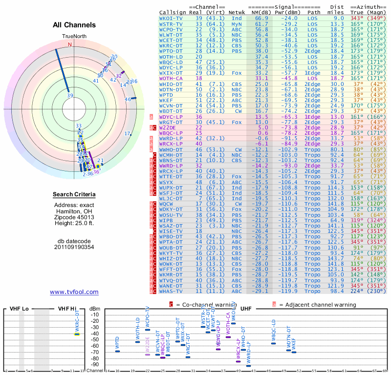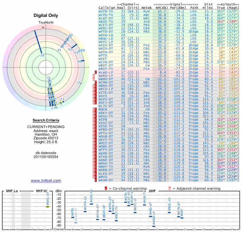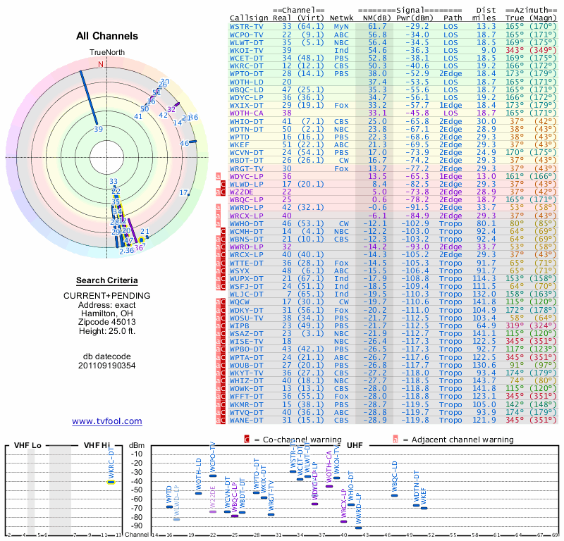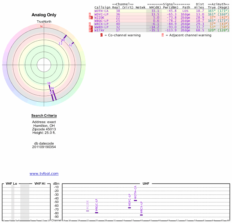 Here are the results for your location. The transmitter database was last updated on June 7, 2013. For more information about these plots and how to interpret them, please check out the Signal Analysis FAQ.
