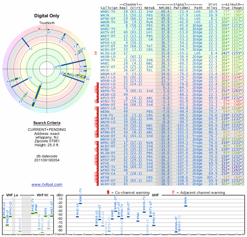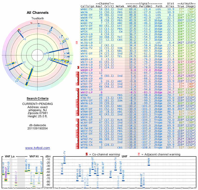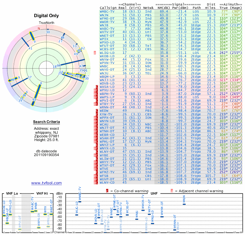 Here are the results for your location. The transmitter database was last updated on June 7, 2013. For more information about these plots and how to interpret them, please check out the Signal Analysis FAQ.