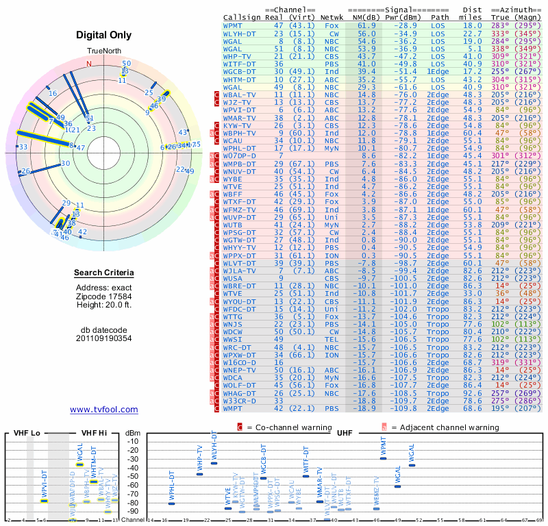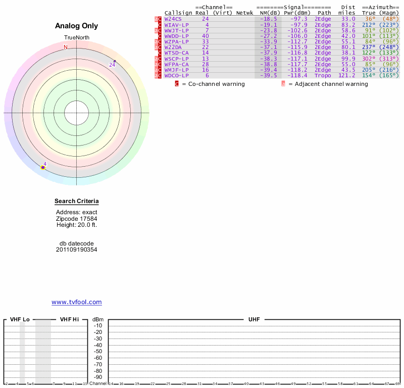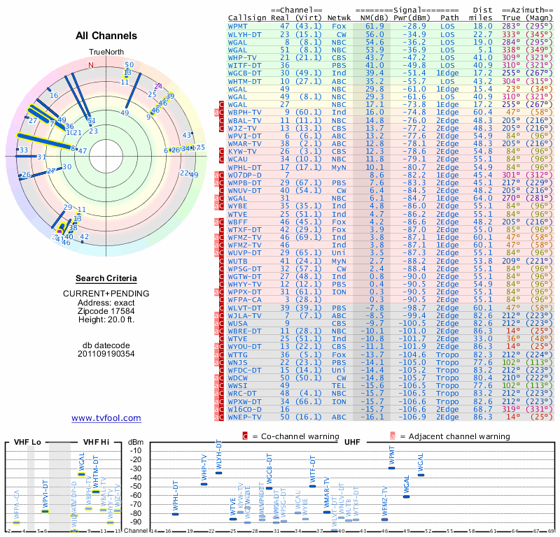 Here are the results for your location. The transmitter database was last updated on June 7, 2013. For more information about these plots and how to interpret them, please check out the Signal Analysis FAQ.