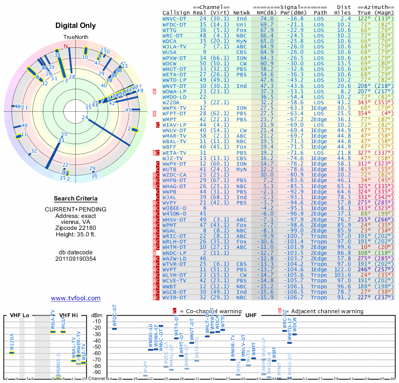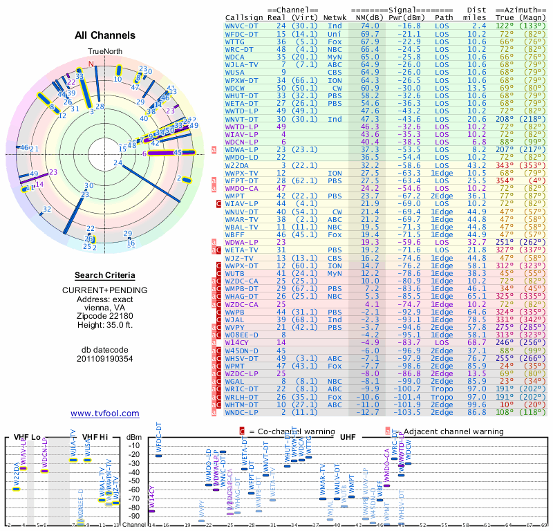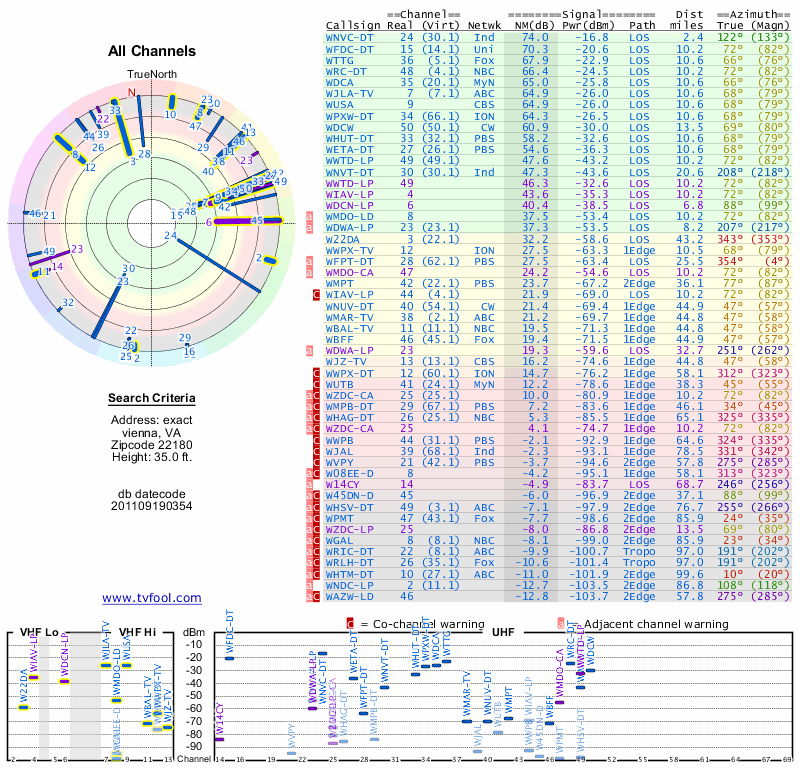 Here are the results for your location. The transmitter database was last updated on June 7, 2013. For more information about these plots and how to interpret them, please check out the Signal Analysis FAQ.