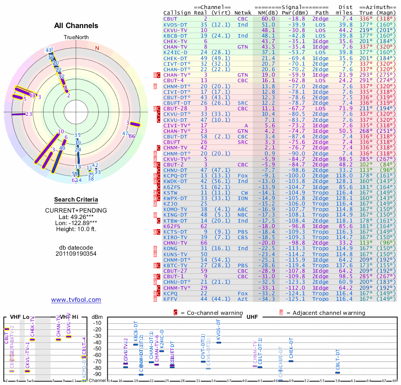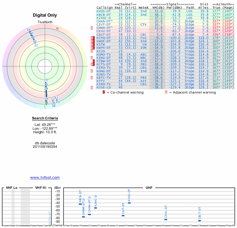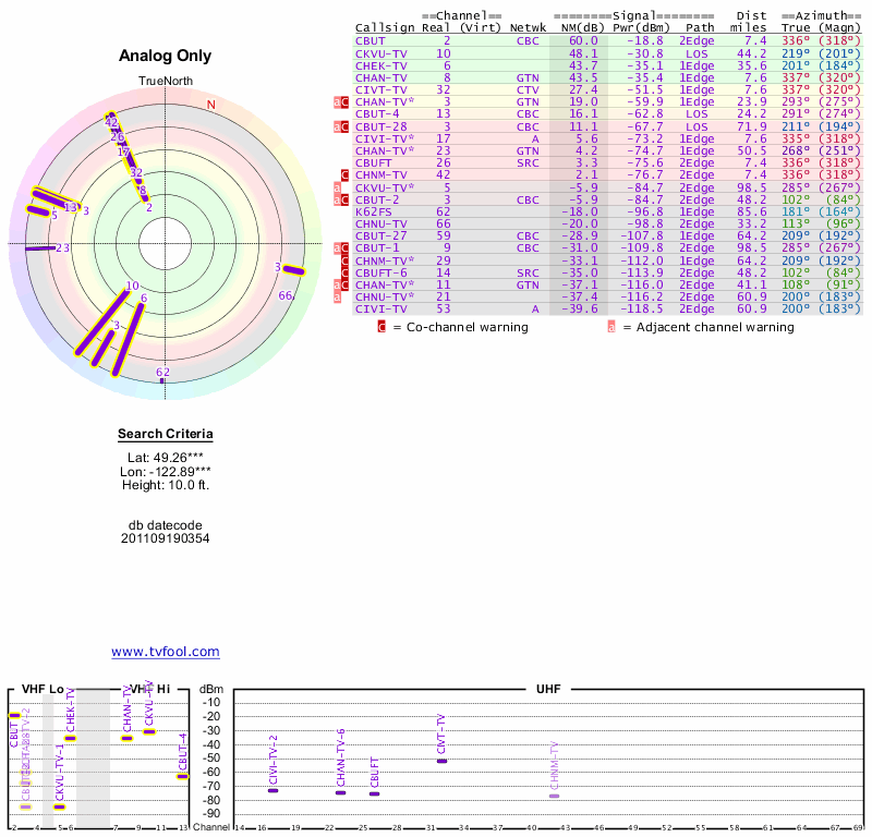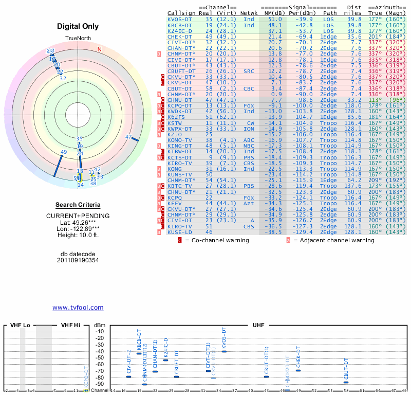 Here are the results for your location. The transmitter database was last updated on June 7, 2013. For more information about these plots and how to interpret them, please check out the Signal Analysis FAQ.