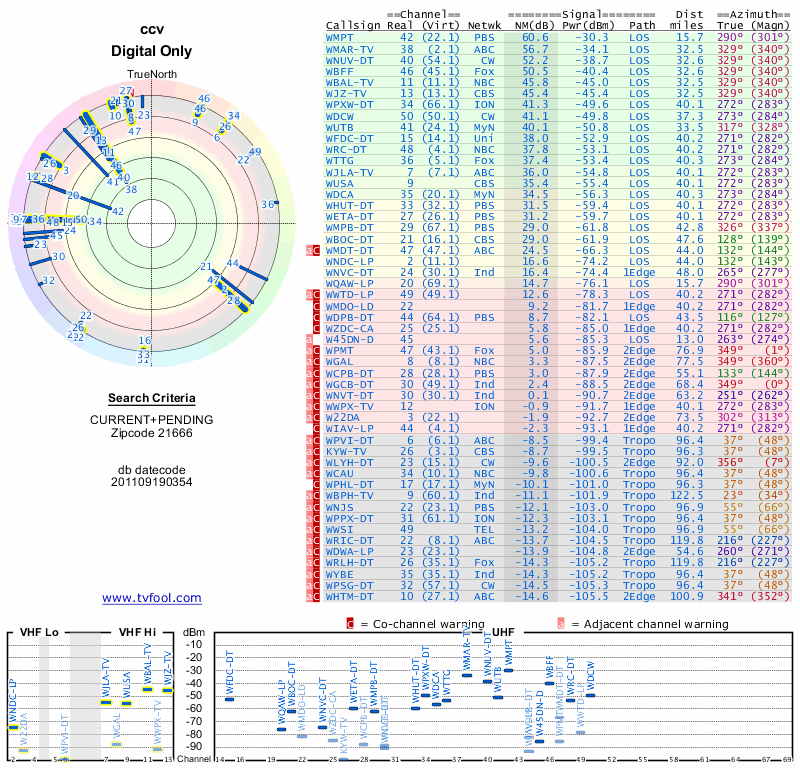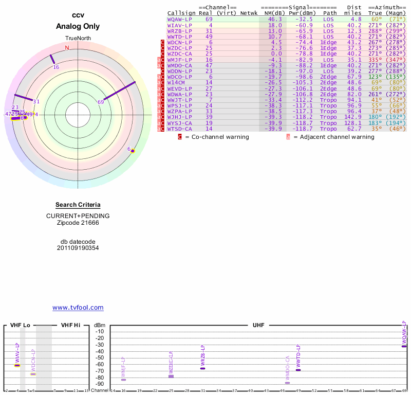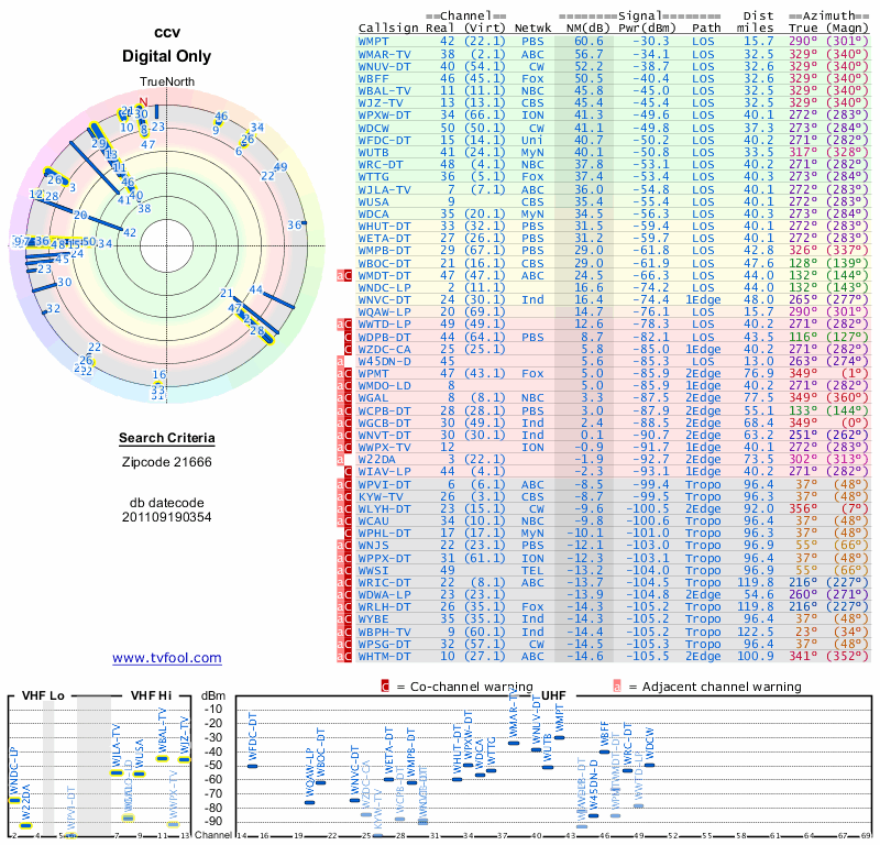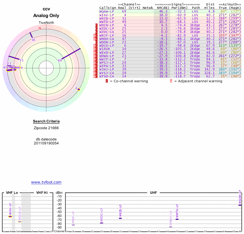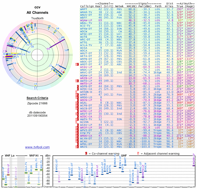 Here are the results for your location. The transmitter database was last updated on June 7, 2013. For more information about these plots and how to interpret them, please check out the Signal Analysis FAQ.