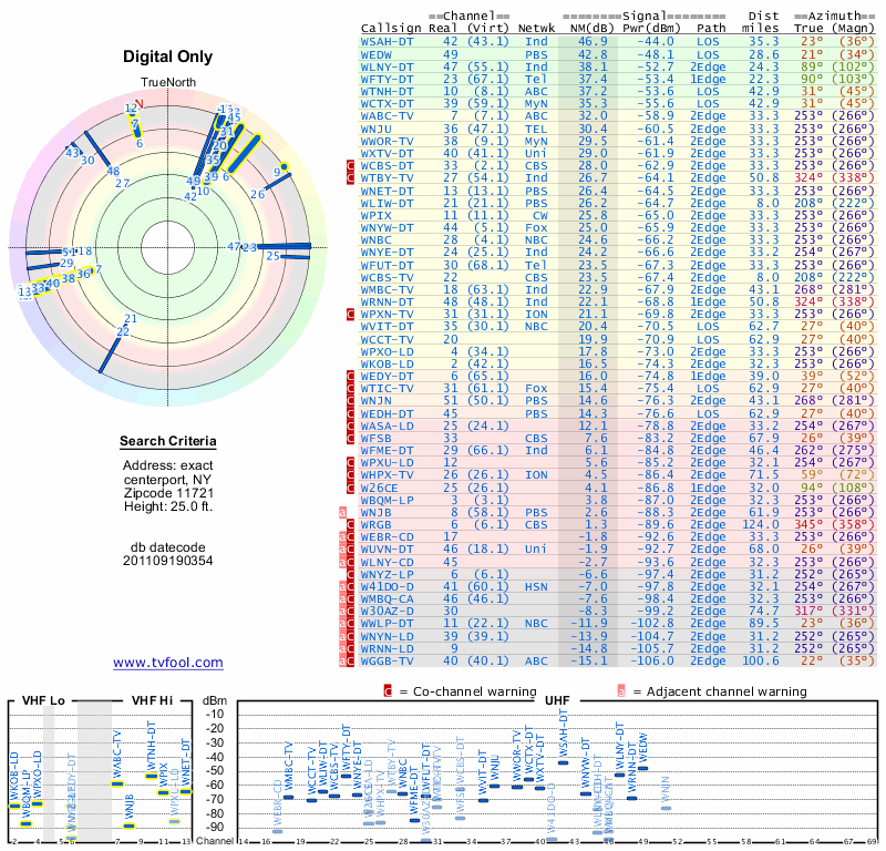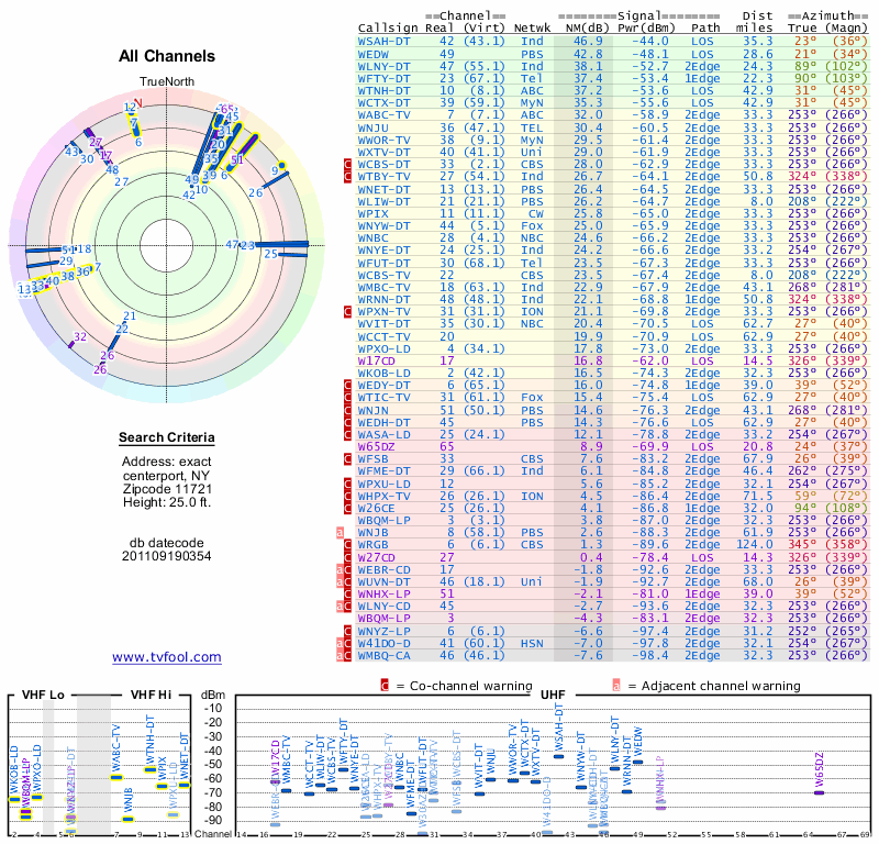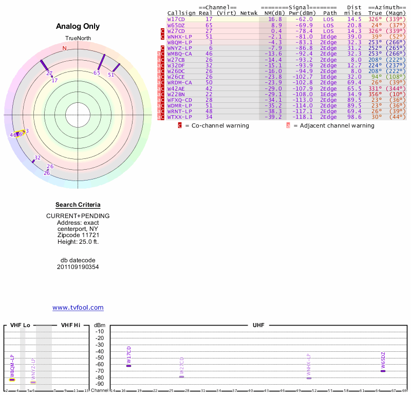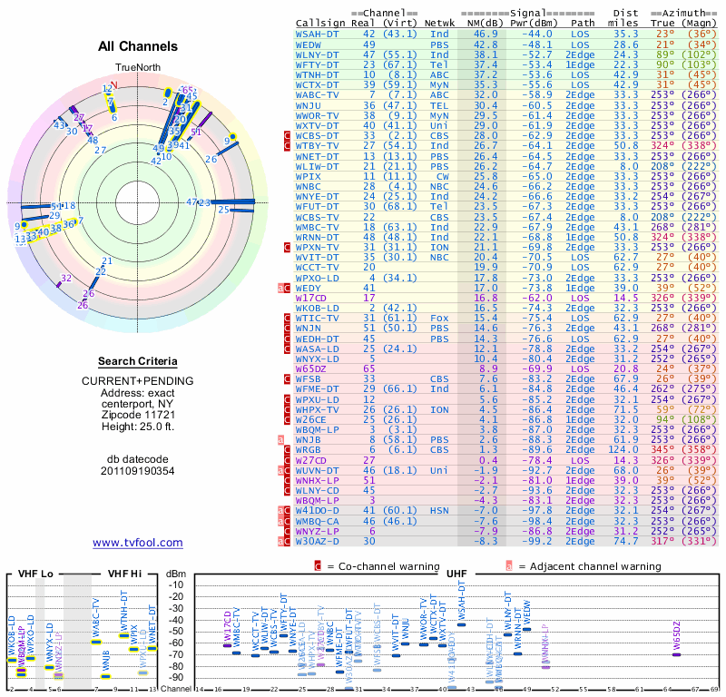 Here are the results for your location. The transmitter database was last updated on June 7, 2013. For more information about these plots and how to interpret them, please check out the Signal Analysis FAQ.