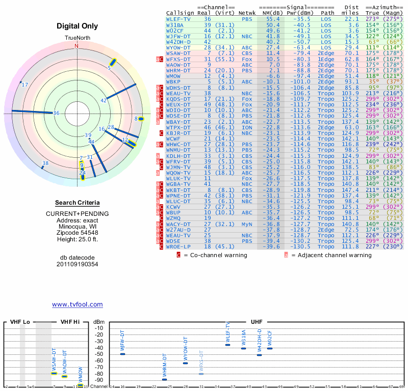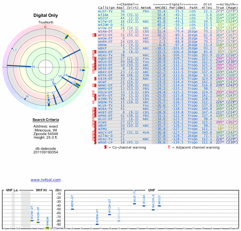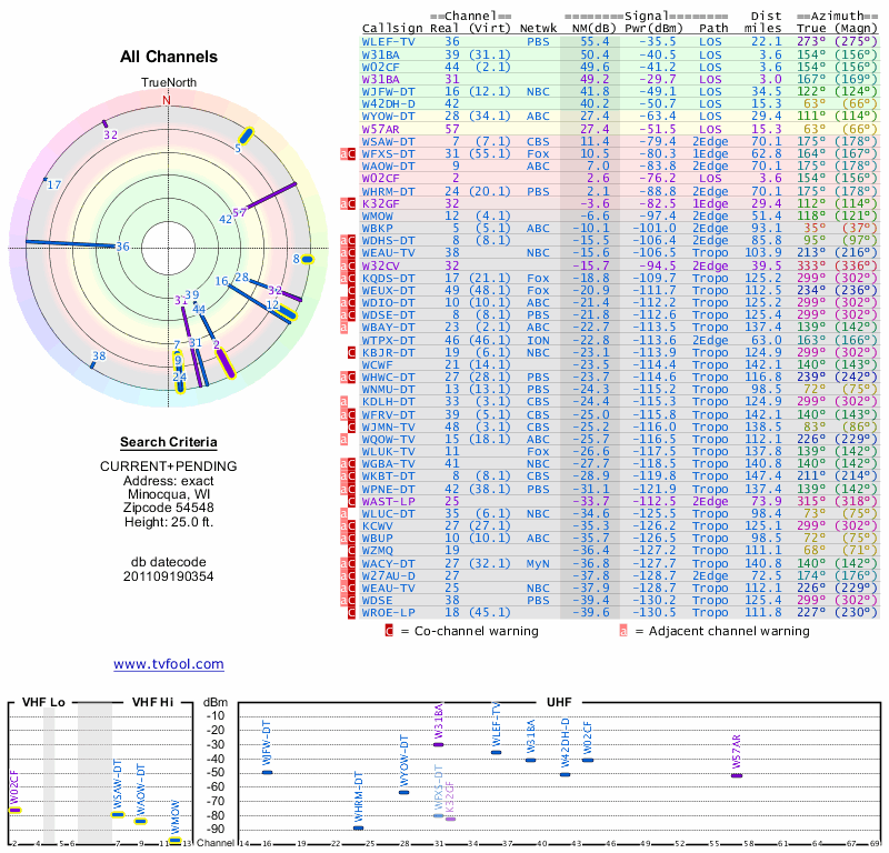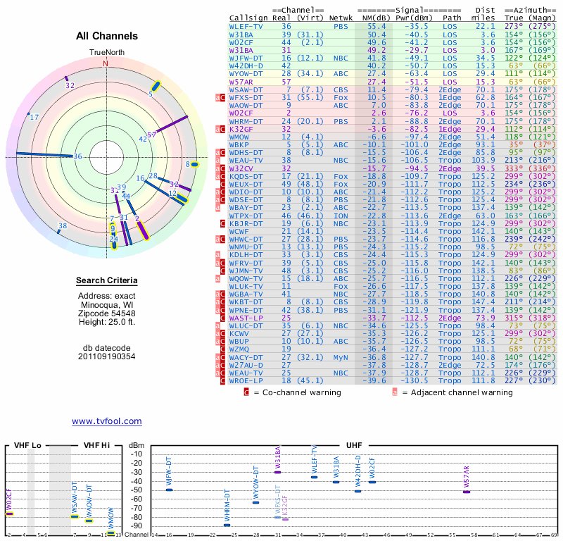 Here are the results for your location. The transmitter database was last updated on June 7, 2013. For more information about these plots and how to interpret them, please check out the Signal Analysis FAQ.
