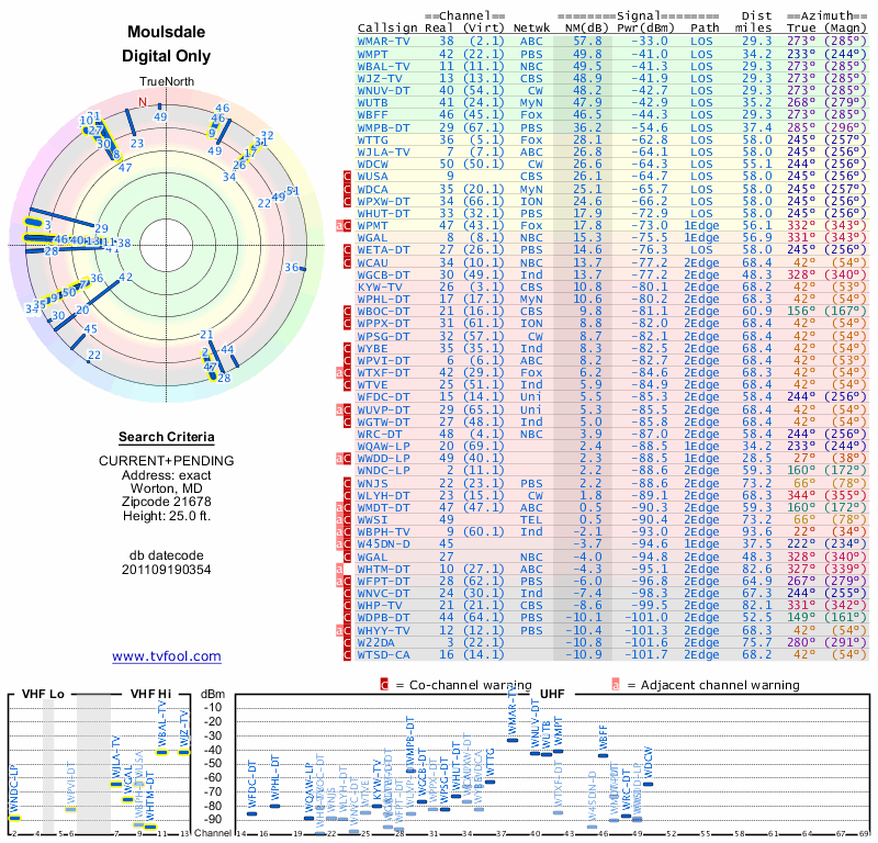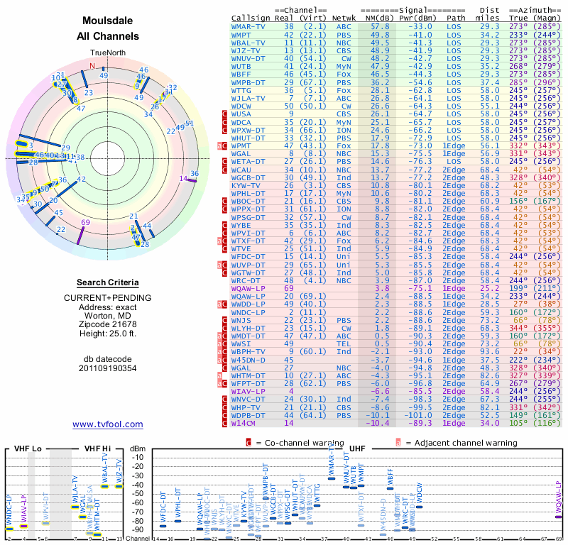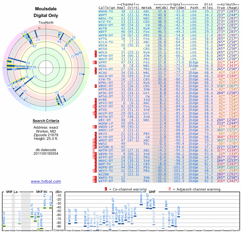 Here are the results for your location. The transmitter database was last updated on June 7, 2013. For more information about these plots and how to interpret them, please check out the Signal Analysis FAQ.