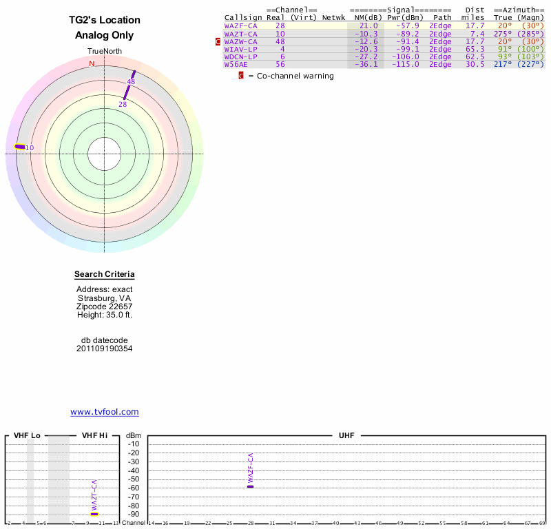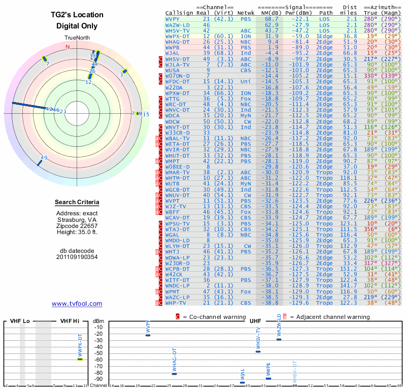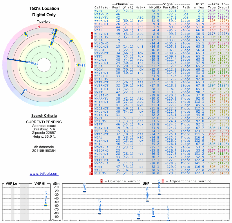 Here are the results for your location. The transmitter database was last updated on June 7, 2013. For more information about these plots and how to interpret them, please check out the Signal Analysis FAQ.