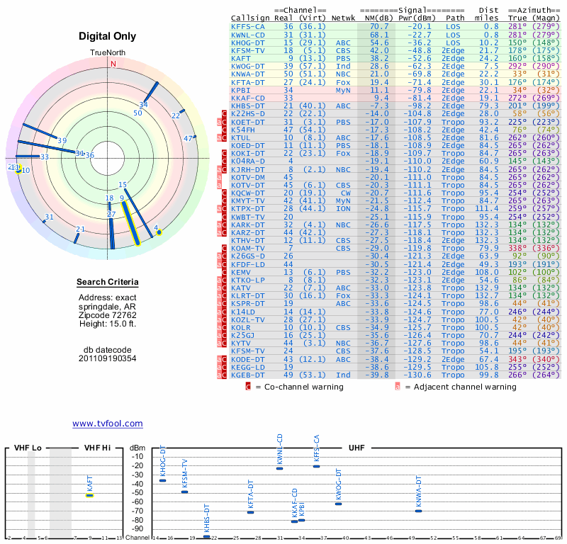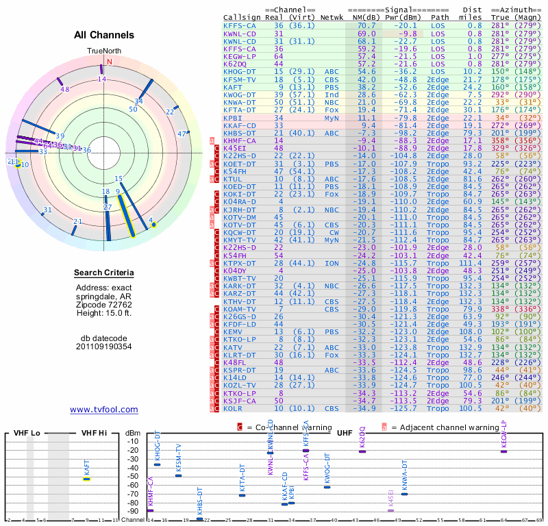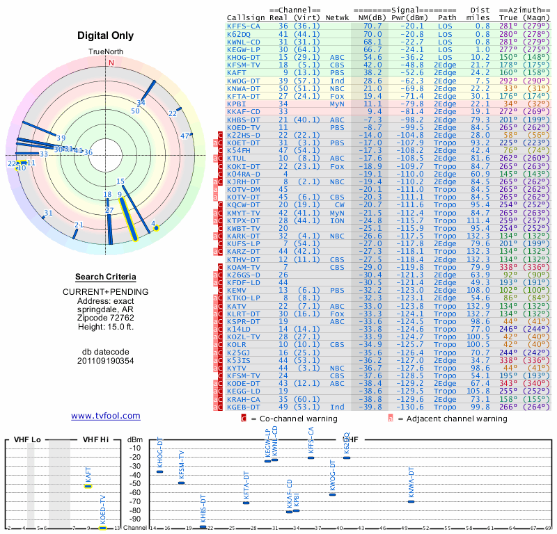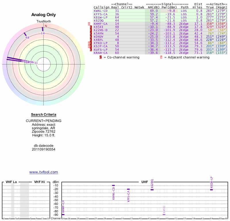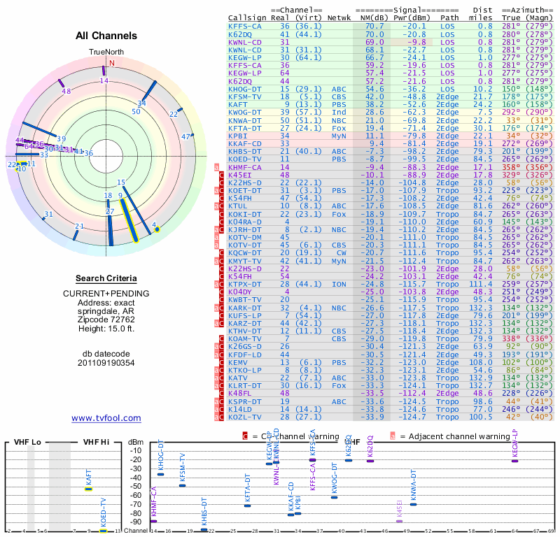 Here are the results for your location. The transmitter database was last updated on June 7, 2013. For more information about these plots and how to interpret them, please check out the Signal Analysis FAQ.