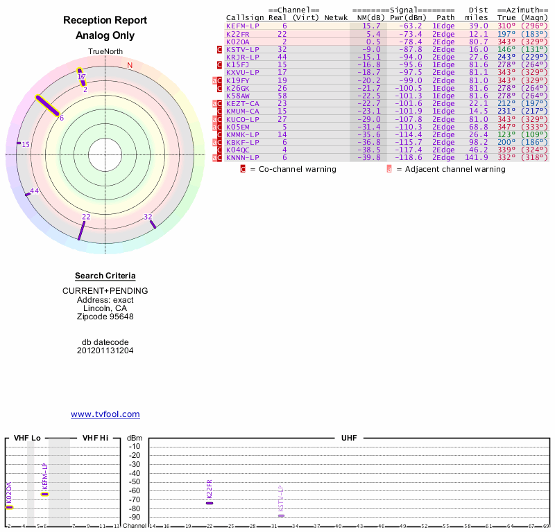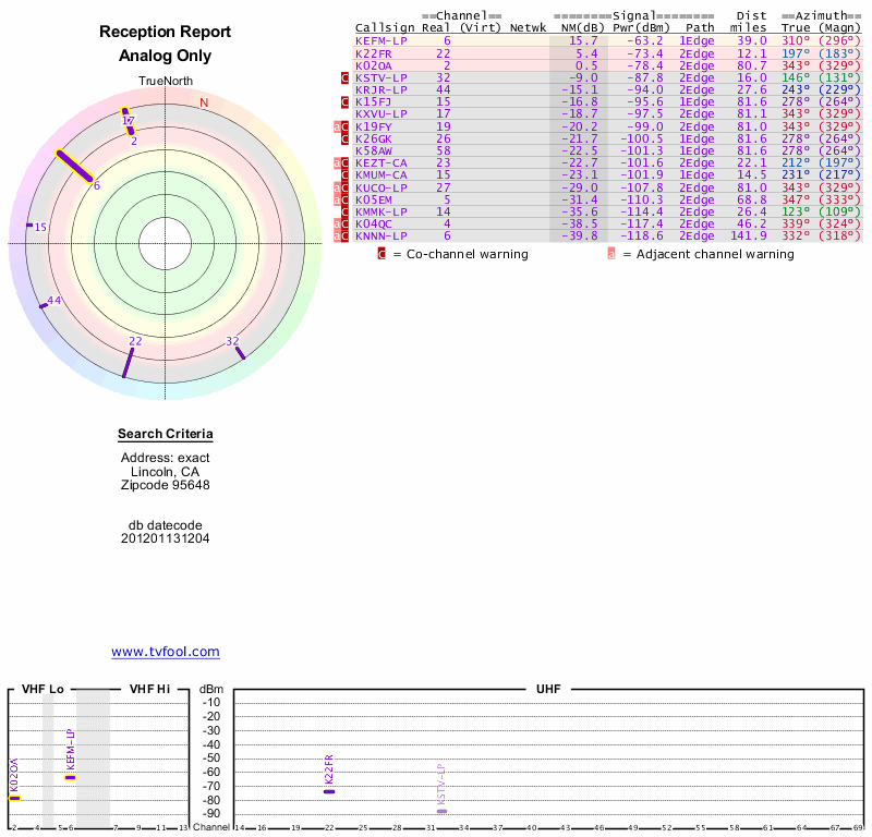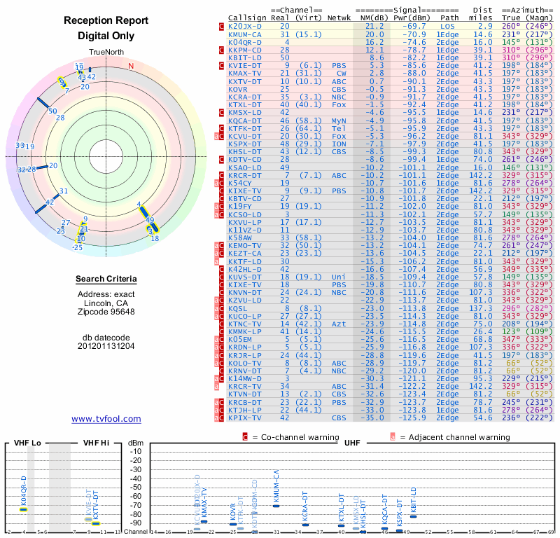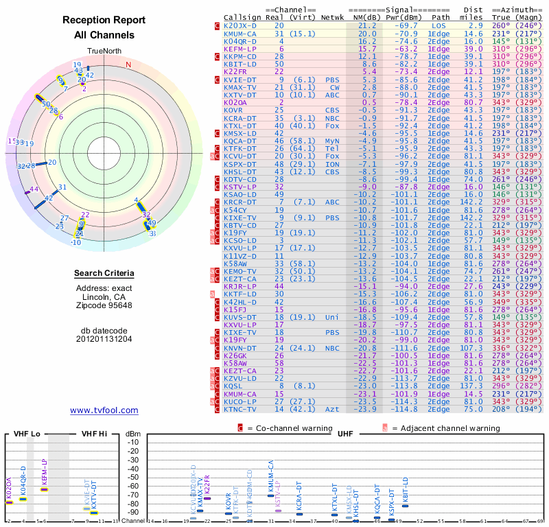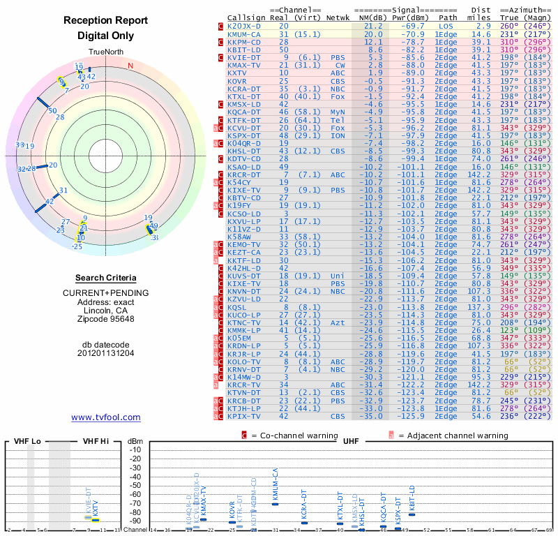 Here are the results for your location. The transmitter database was last updated on June 7, 2013. For more information about these plots and how to interpret them, please check out the Signal Analysis FAQ.