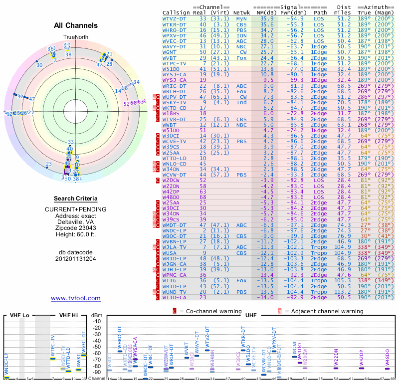 Here are the results for your location. The transmitter database was last updated on June 7, 2013. For more information about these plots and how to interpret them, please check out the Signal Analysis FAQ.