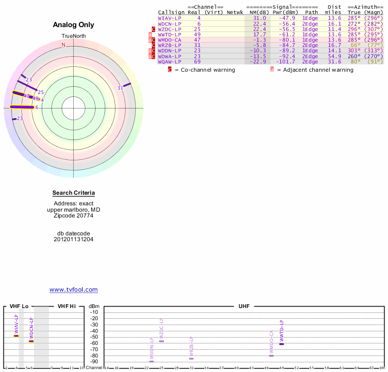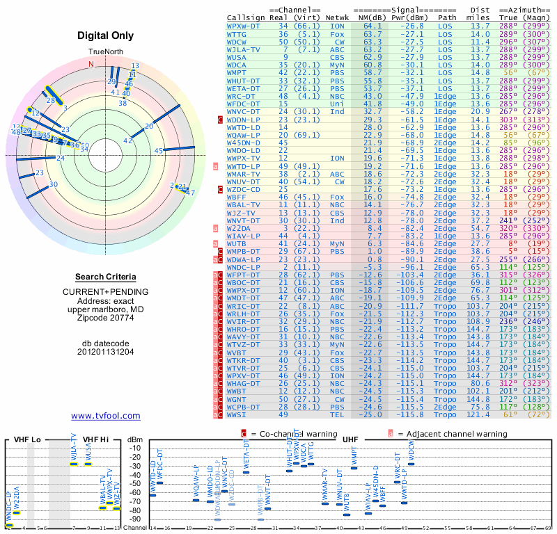 Here are the results for your location. The transmitter database was last updated on June 7, 2013. For more information about these plots and how to interpret them, please check out the Signal Analysis FAQ.