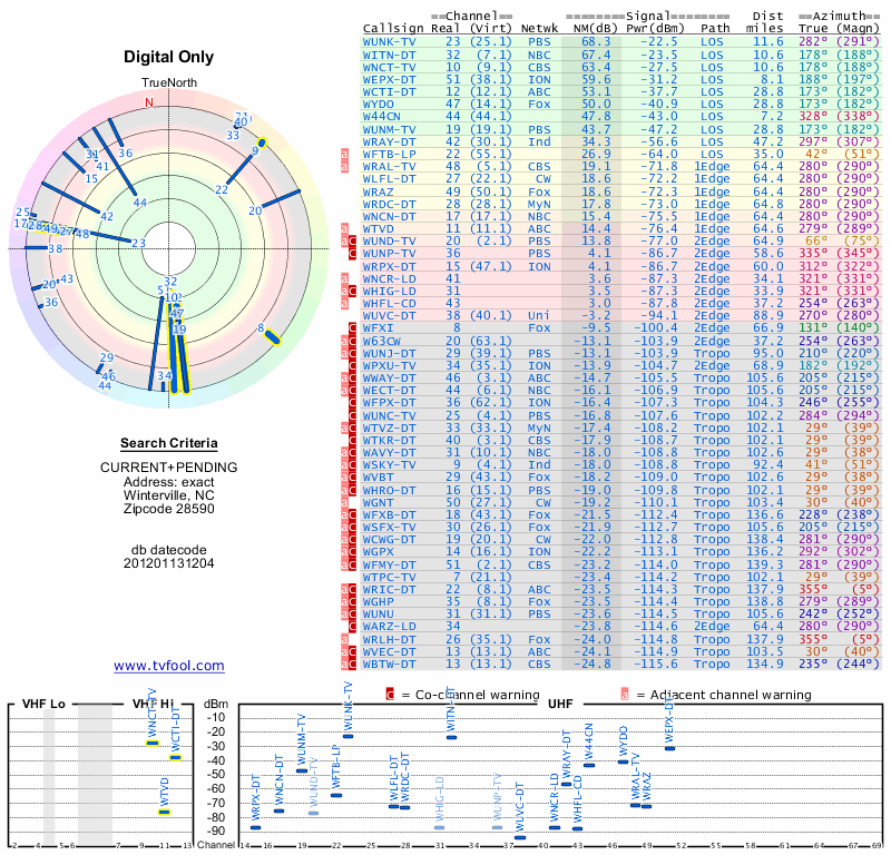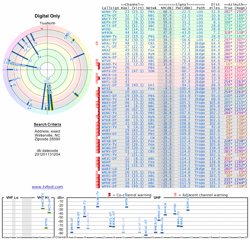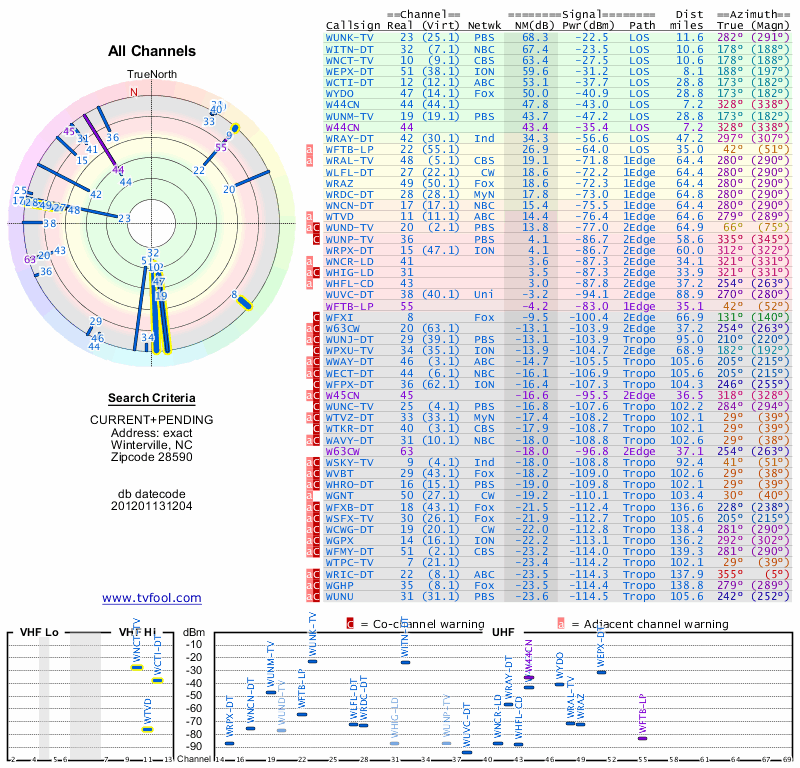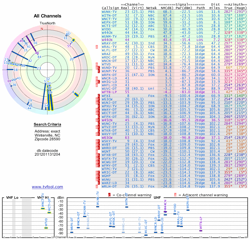Here are the results for your location. The transmitter database was last updated on June 7, 2013. For more information about these plots and how to interpret them, please check out the Signal Analysis FAQ.