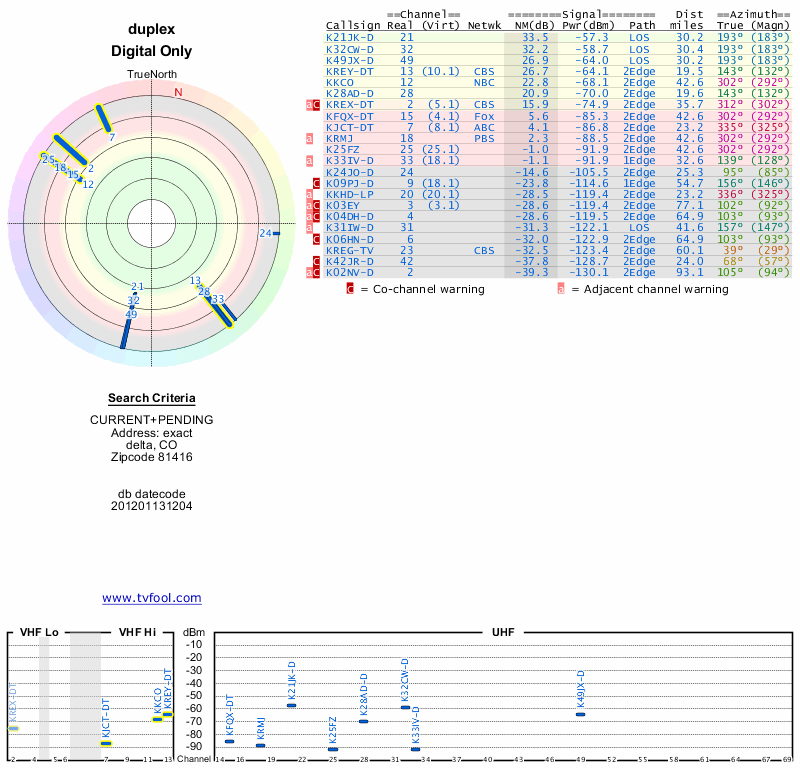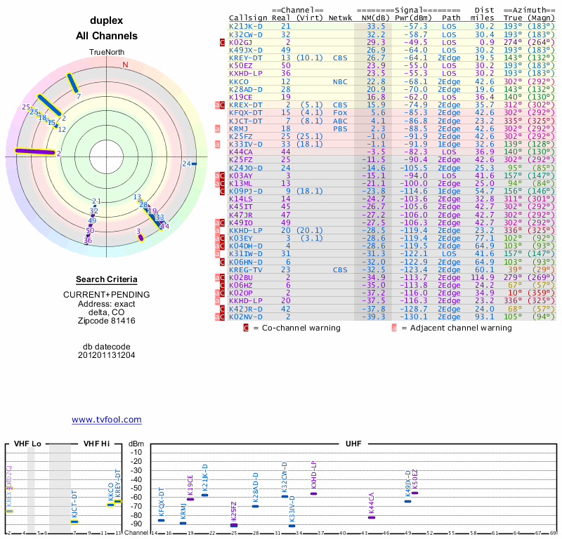 Here are the results for your location. The transmitter database was last updated on June 7, 2013. For more information about these plots and how to interpret them, please check out the Signal Analysis FAQ.