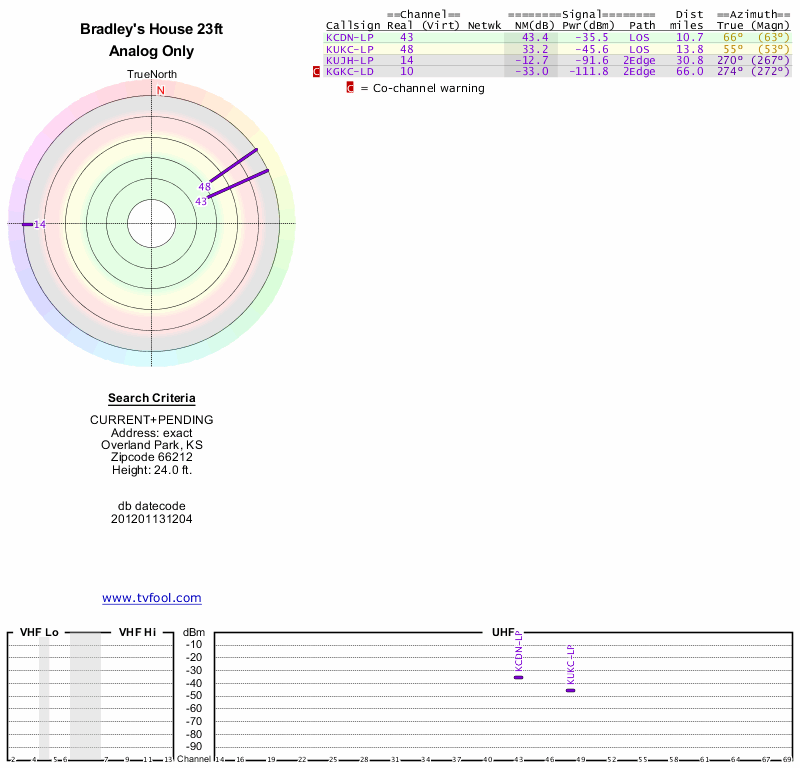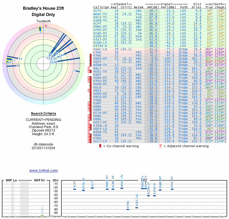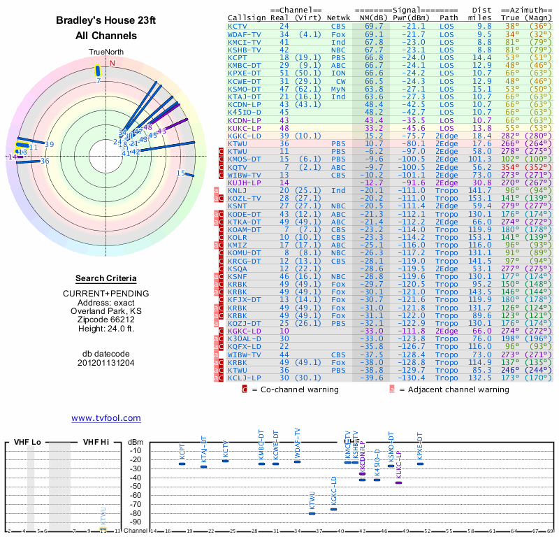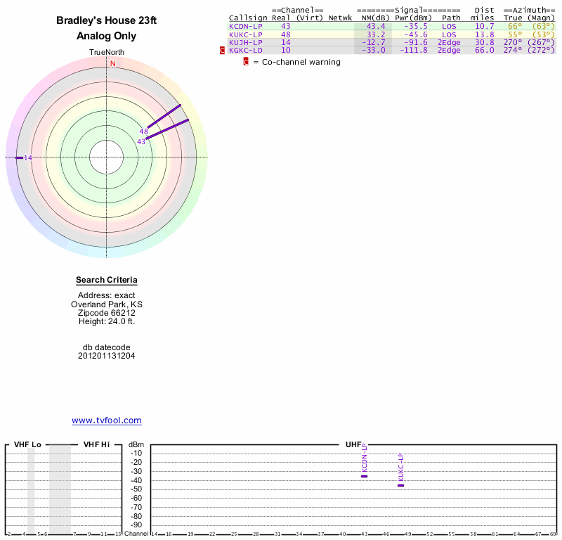 Here are the results for your location. The transmitter database was last updated on June 7, 2013. For more information about these plots and how to interpret them, please check out the Signal Analysis FAQ.
