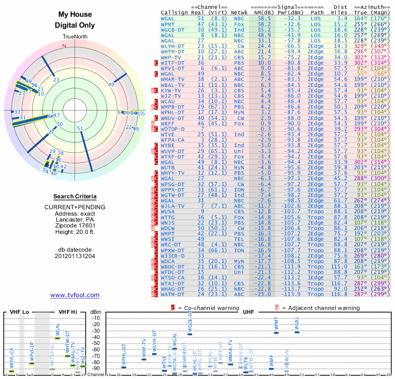 Here are the results for your location. The transmitter database was last updated on June 7, 2013. For more information about these plots and how to interpret them, please check out the Signal Analysis FAQ.