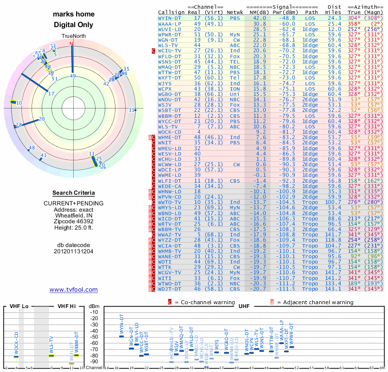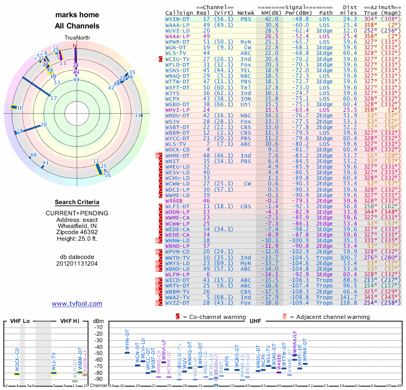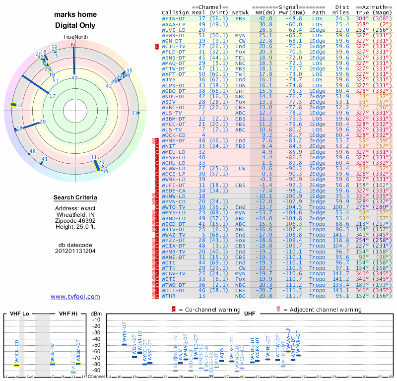 Here are the results for your location. The transmitter database was last updated on June 7, 2013. For more information about these plots and how to interpret them, please check out the Signal Analysis FAQ.