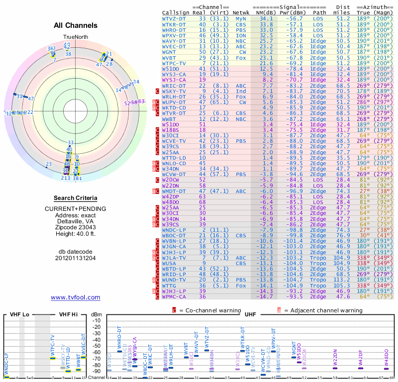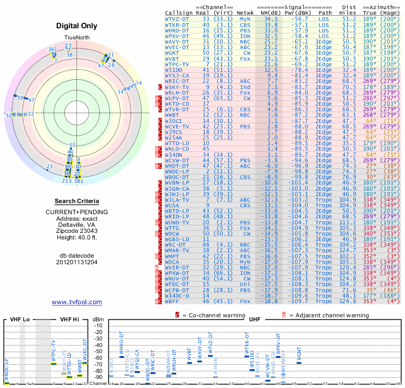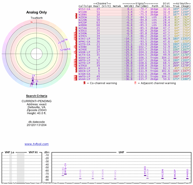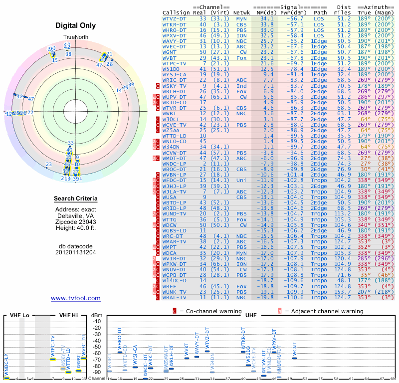 Here are the results for your location. The transmitter database was last updated on June 7, 2013. For more information about these plots and how to interpret them, please check out the Signal Analysis FAQ.