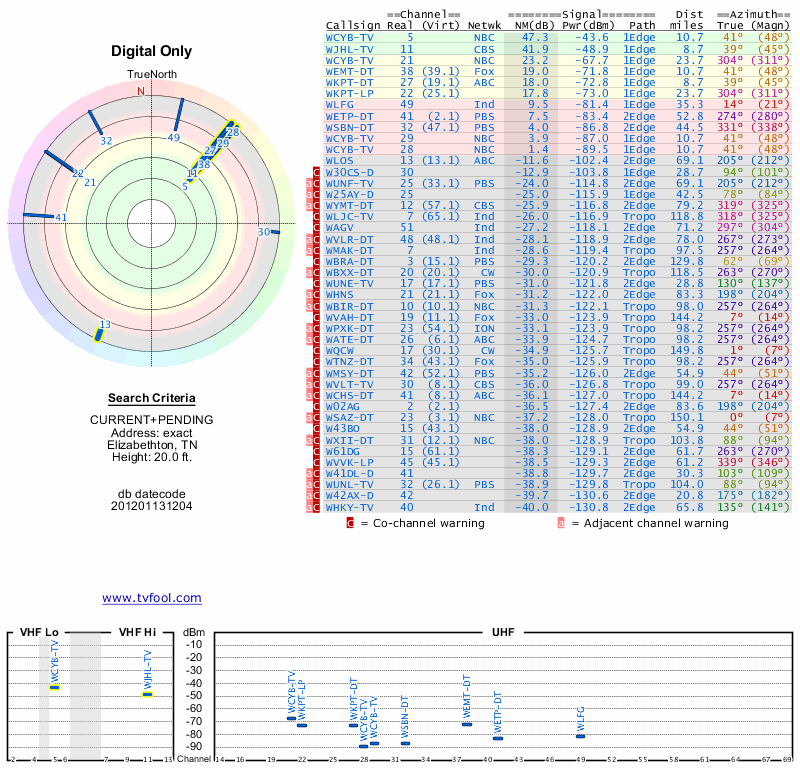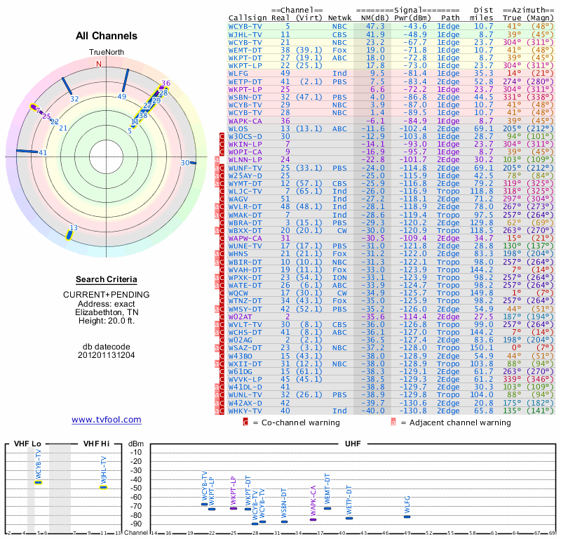 Here are the results for your location. The transmitter database was last updated on June 7, 2013. For more information about these plots and how to interpret them, please check out the Signal Analysis FAQ.