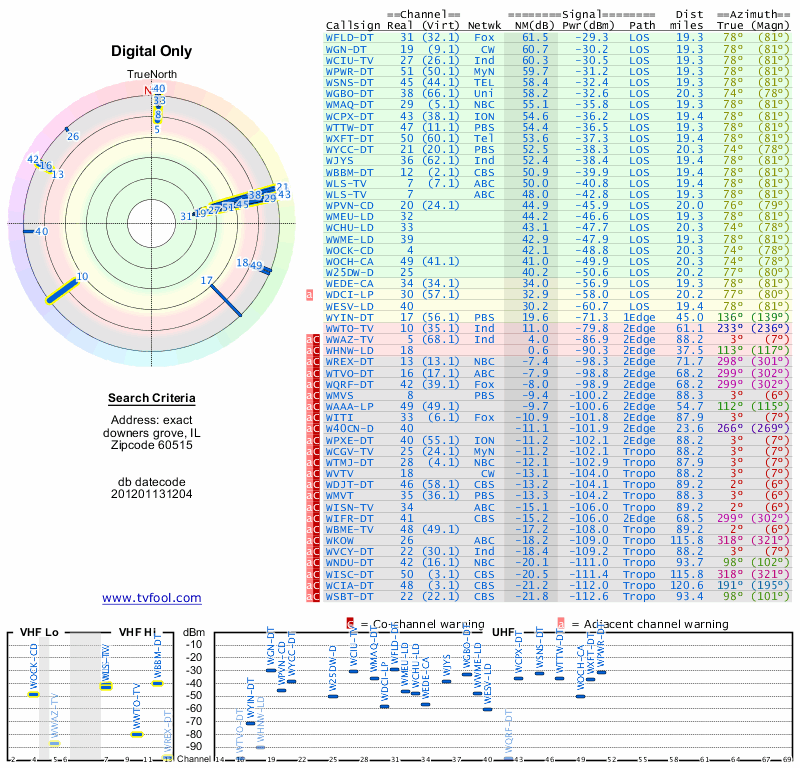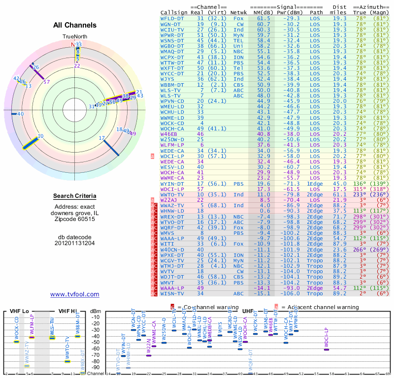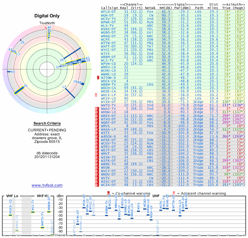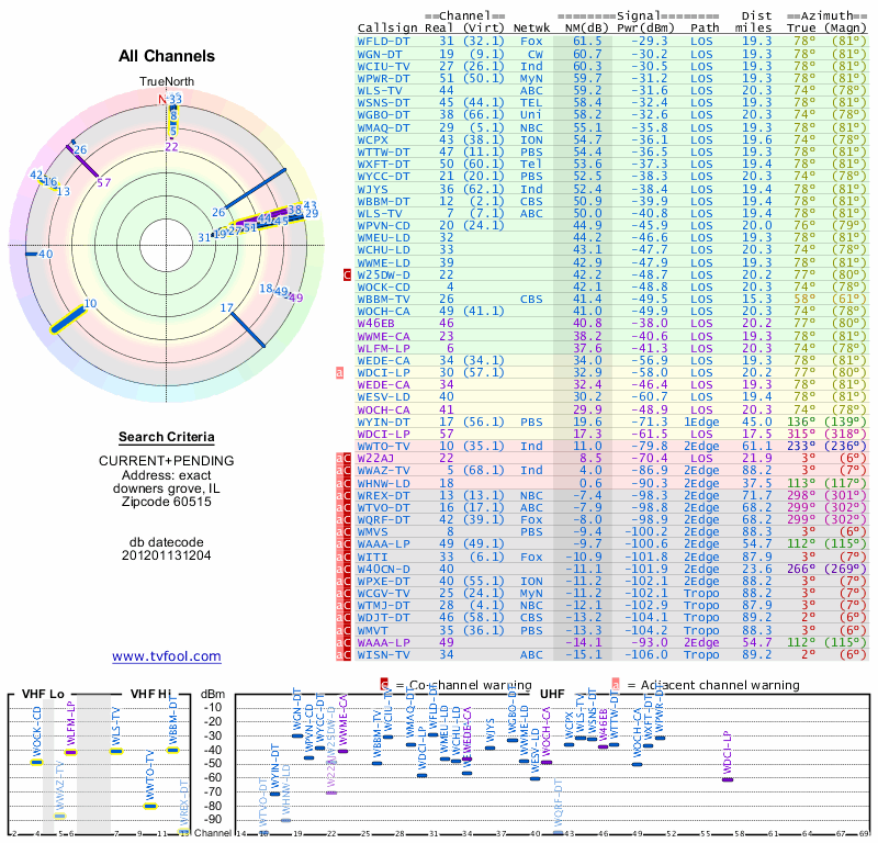 Here are the results for your location. The transmitter database was last updated on June 7, 2013. For more information about these plots and how to interpret them, please check out the Signal Analysis FAQ.