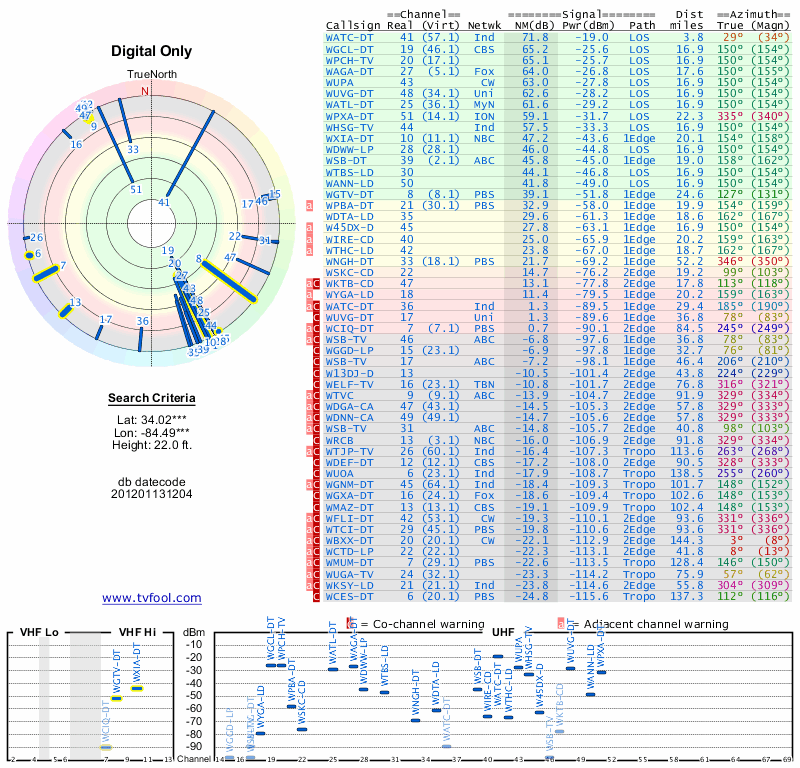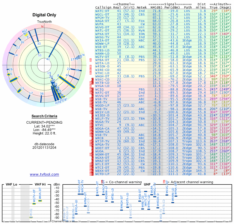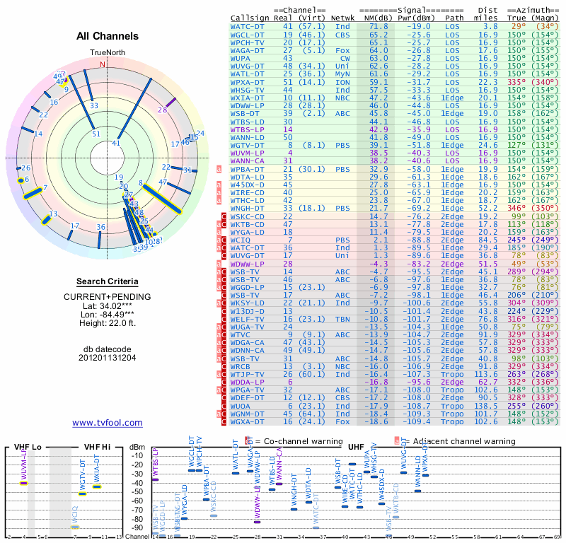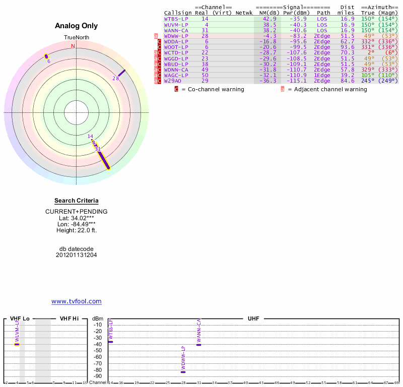 Here are the results for your location. The transmitter database was last updated on June 7, 2013. For more information about these plots and how to interpret them, please check out the Signal Analysis FAQ.