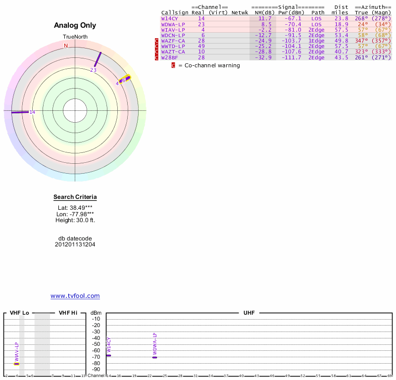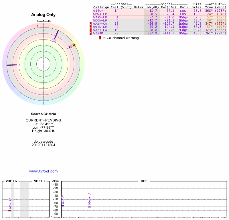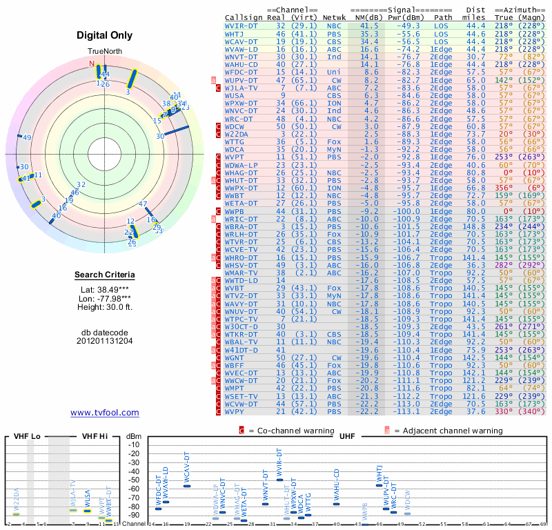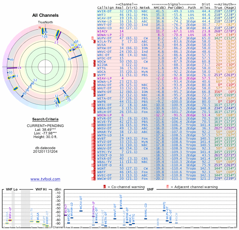 Here are the results for your location. The transmitter database was last updated on June 7, 2013. For more information about these plots and how to interpret them, please check out the Signal Analysis FAQ.