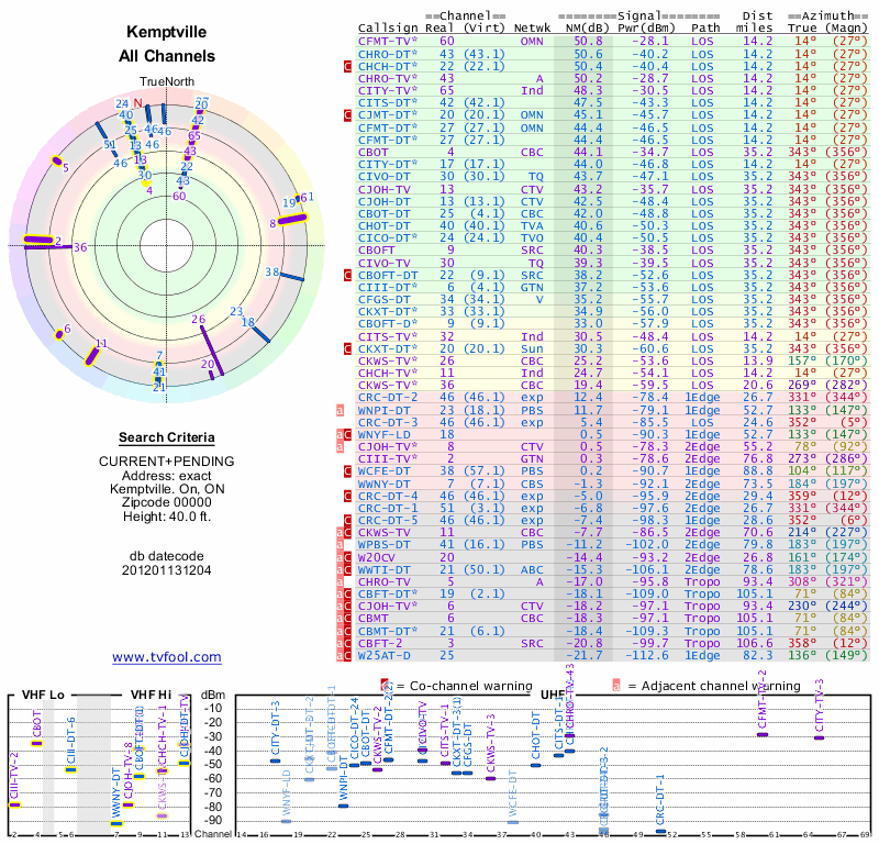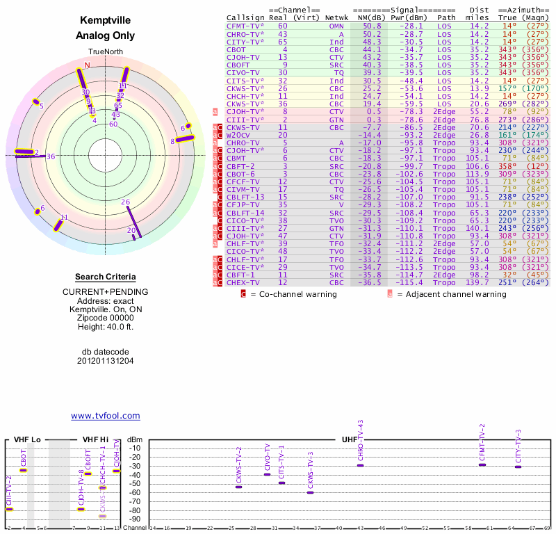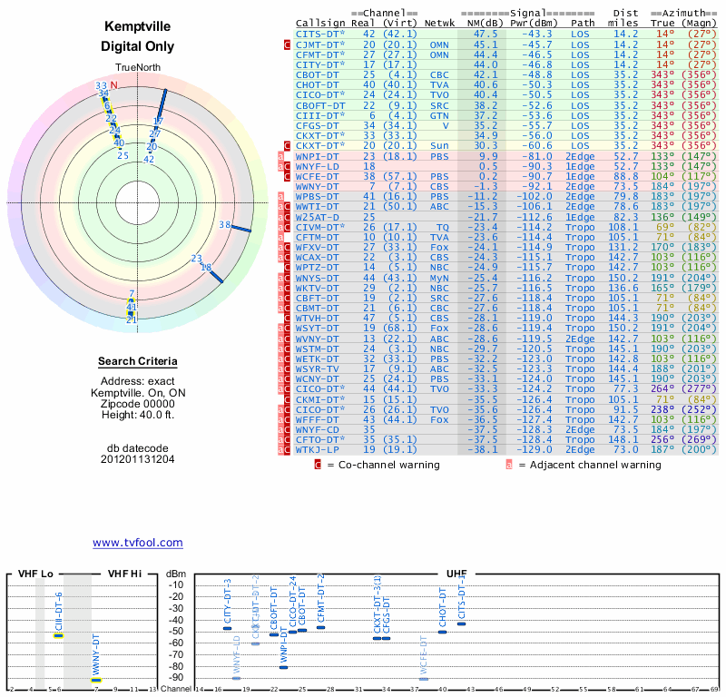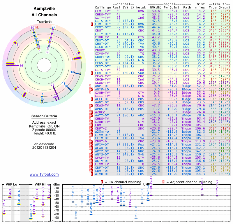 Here are the results for your location. The transmitter database was last updated on June 7, 2013. For more information about these plots and how to interpret them, please check out the Signal Analysis FAQ.