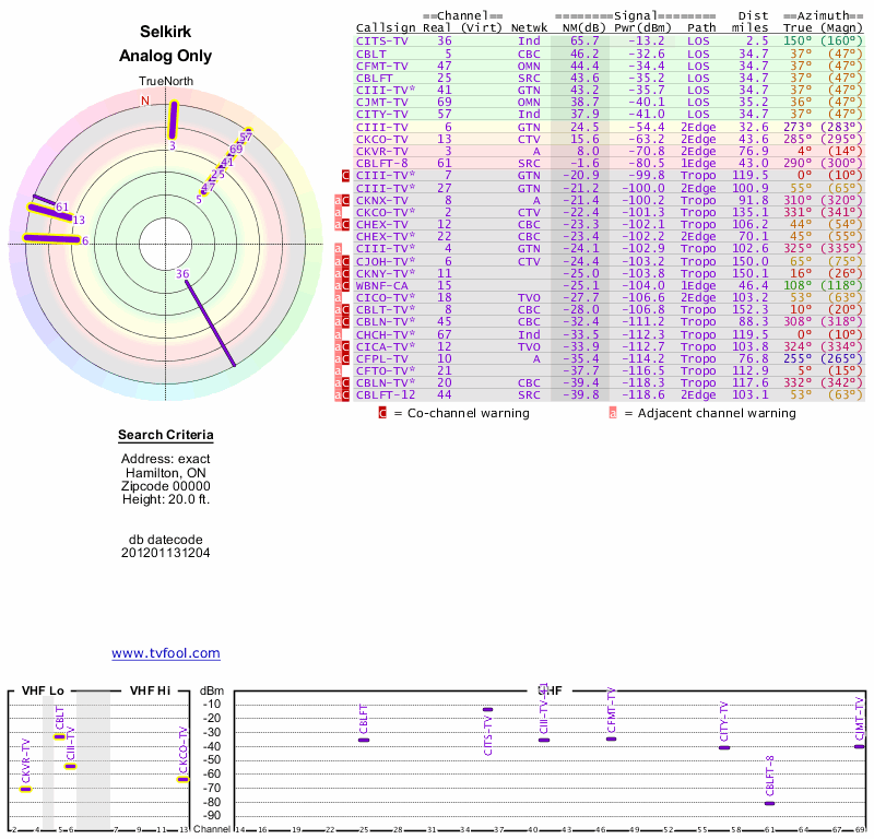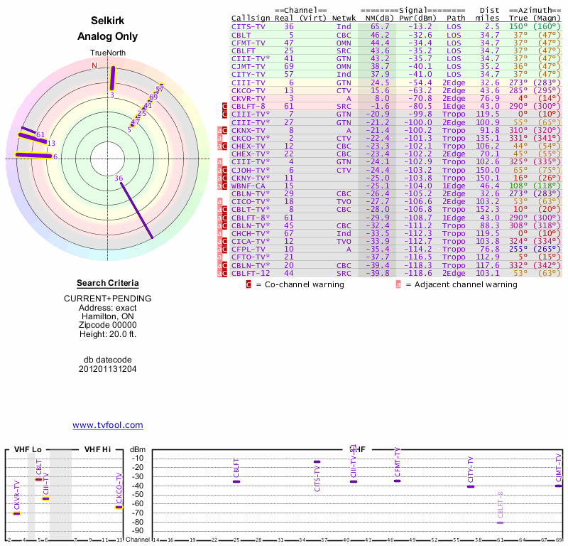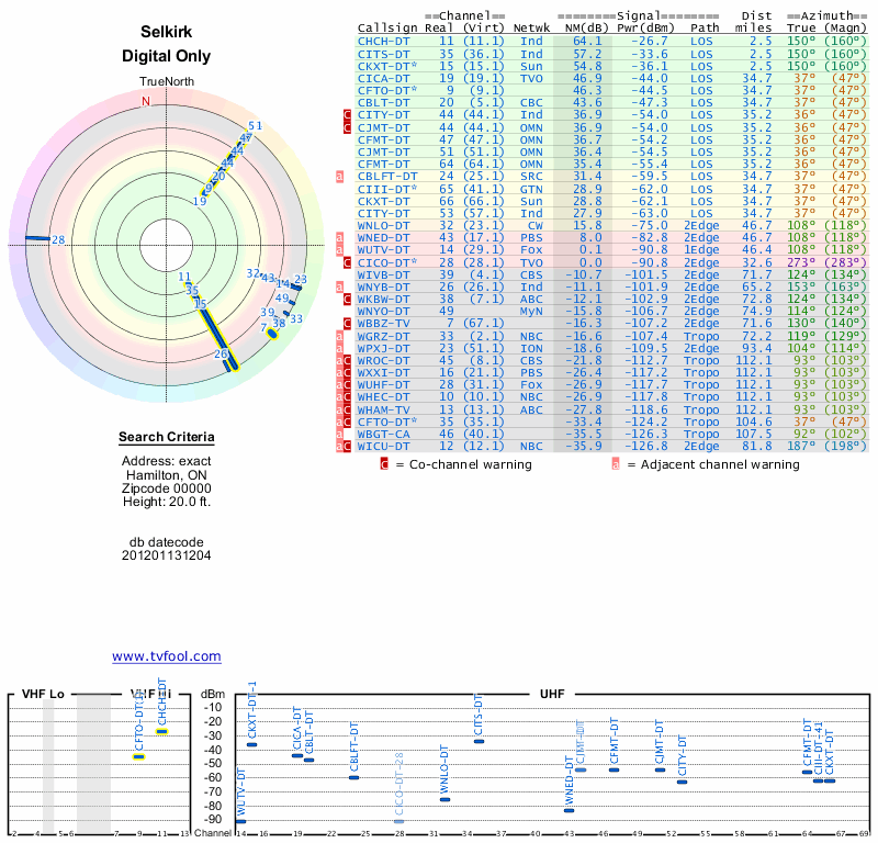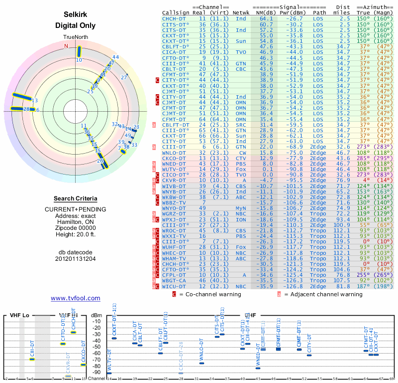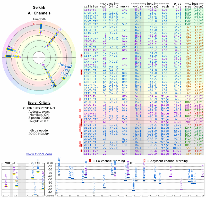 Here are the results for your location. The transmitter database was last updated on June 7, 2013. For more information about these plots and how to interpret them, please check out the Signal Analysis FAQ.