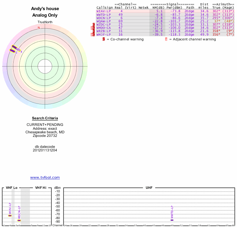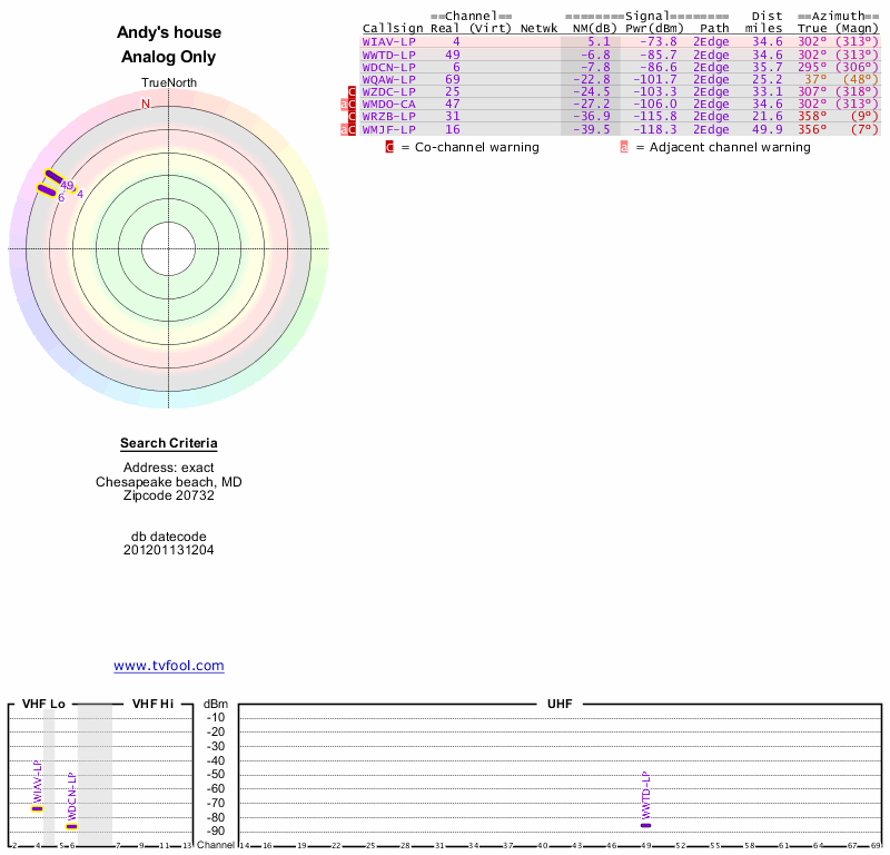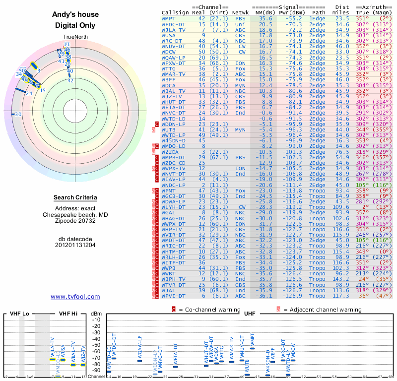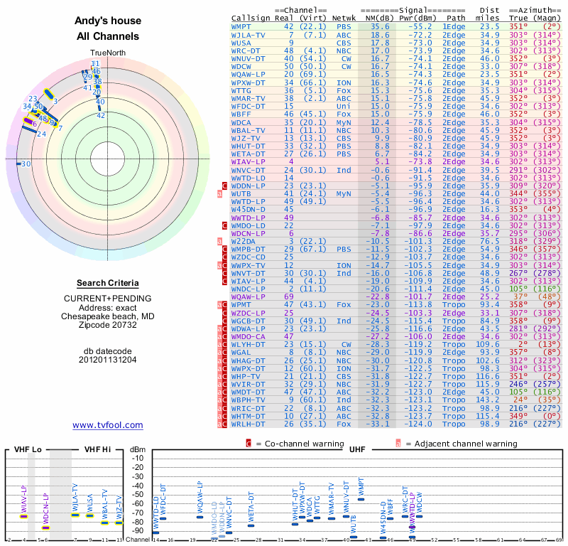 Here are the results for your location. The transmitter database was last updated on June 7, 2013. For more information about these plots and how to interpret them, please check out the Signal Analysis FAQ.