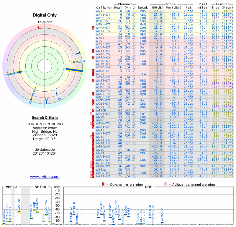 Here are the results for your location. The transmitter database was last updated on June 7, 2013. For more information about these plots and how to interpret them, please check out the Signal Analysis FAQ.